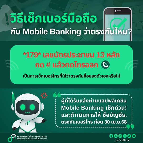 30 เมษายน 2568 ตามที่คณะกรรมการป้องกันและปราบปรามอาชญากรรมทางเทคโนโลยี ได้ดำเนินมาตรการ "การยกระดับความปลอดภัยในการใช้ Mobile Banking" ซึ่งเริ่มดำเนินมาตรการฯ ตั้งแต่วันที่ 1 กุมภาพันธ์ 2568 ซึ่งจะมีการแจ้งเตือนกลุ่มที่ต้อง "ยืนยันตัวตน" ผ่านแอปฯ Mobile Banking เท่านั้น ภายในวันที่ 30 เมษายน 2568 เพื่อป้องกันและปราบปรามอาชญากรรมออนไลน์ โดยเฉพาะแก๊งคอลเซ็นเตอร์และบัญชีม้า เพื่อให้ชื่อบัญชีโมบายแบงกิ้งตรงกับชื่อเจ้าของซิมมือถือ