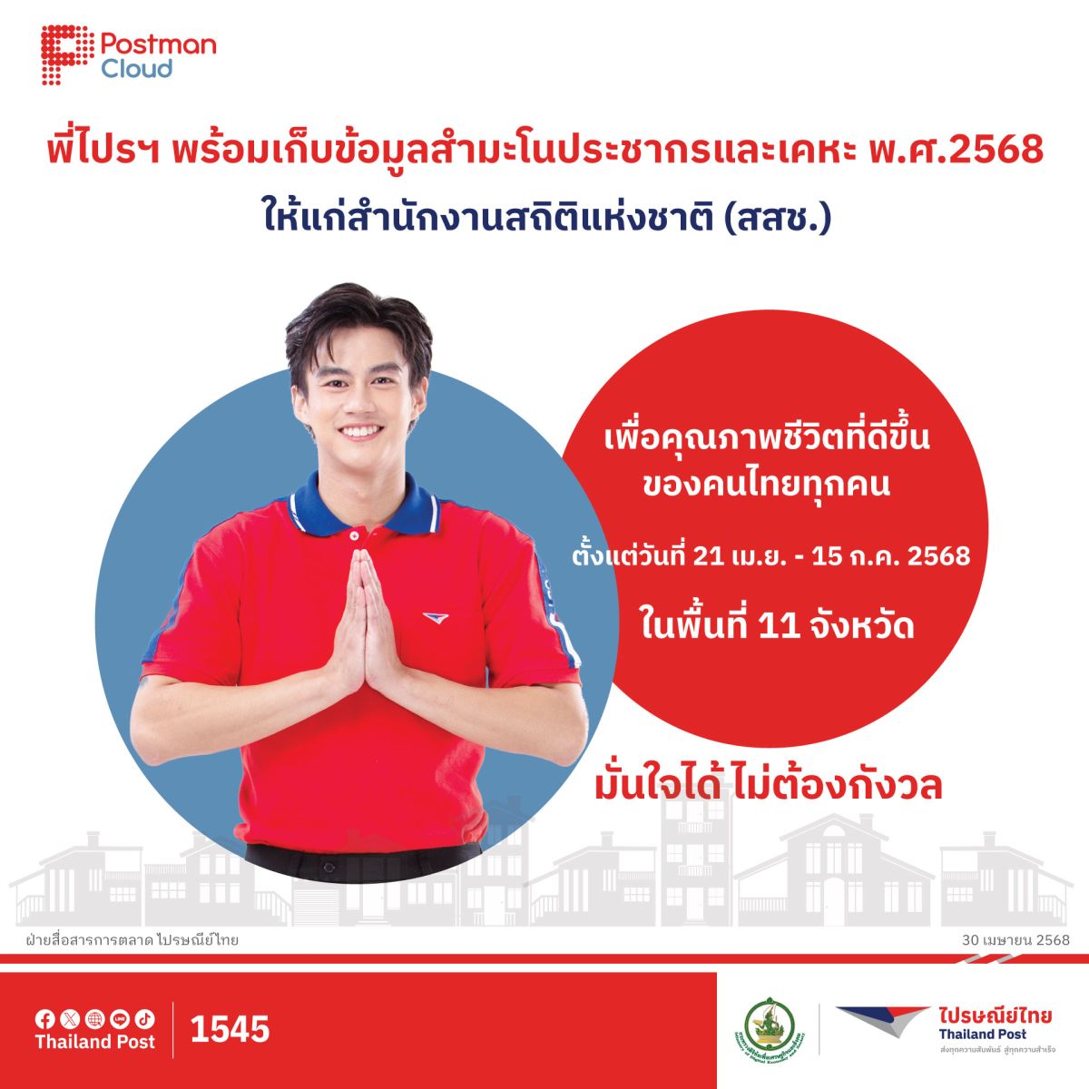 “ไปรษณีย์ไทยมีความยินดีเป็นอย่างยิ่งที่ได้ร่วมเป็นส่วนหนึ่งของภารกิจสำคัญระดับประเทศครั้งนี้ โดยใช้เครือข่ายบุรุษไปรษณีย์หรือพี่ไปรฯ ที่มีความเชี่ยวชาญและความคุ้นเคยกับพื้นที่ทั่วประเทศ มาทำหน้าที่เป็นผู้สำรวจข้อมูลเชิงสถิติให้กับ สสช. ตั้งแต่วันที่ 21 เมษายน 2568 เป็นต้นไป ซึ่งการลงพื้นที่ของพี่ไปรฯ จะมาในยูนิฟอร์มบุรุษไปรษณีย์ตามปกติพร้อมกับบัตรประจำตัวสำหรับยืนยันตัวตน เพื่อสร้างความมั่นใจให้กับประชาชนว่ามาจากโครงการสำรวจของภาครัฐโดยตรง โดยเจ้าหน้าที่ จะบันทึกข้อมูลสำคัญ เช่น จำนวนสมาชิกในครัวเรือน เพศ อายุ การศึกษา อาชีพ สถานภาพสมรส และลักษณะที่อยู่อาศัย และจะไม่มีการสอบข้อมูลเชิงลึก เช่น เบอร์โทรติดต่อ สถานภาพและข้อมูลธุรกรรม ด้านการเงิน เรามั่นใจว่าพี่ไปรฯ จะสามารถดำเนินการเก็บข้อมูลได้อย่างถูกต้องและครบถ้วน ภายใต้มาตรฐานที่เข้มงวด ทั้งนี้ ข้อมูลที่ได้รับจะถูกเก็บรักษาอย่างปลอดภัย และนำไปใช้เพื่อการพัฒนาอย่างแท้จริง อย่างไรก็ตาม ไปรษณีย์ไทยขอความร่วมมือจากประชาชน ในการให้ข้อมูลที่ถูกต้องเพื่อทำให้โครงการในปีนี้เกิดประโยชน์อย่างสูงสุด”