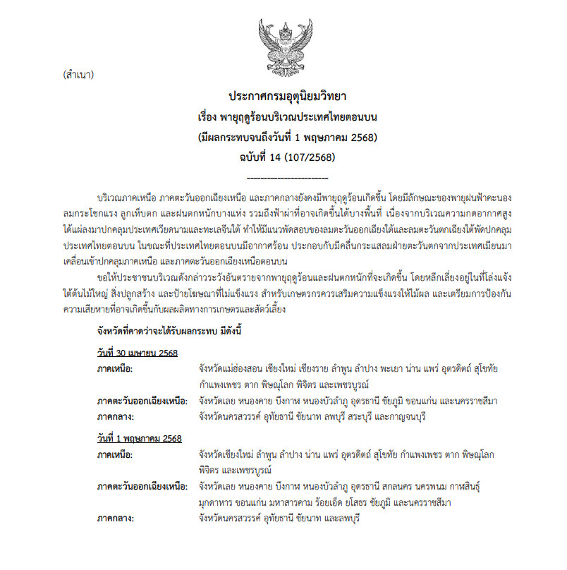 ประกาศกรมอุตุนิยมวิทยา เรื่อง พายุฤดูร้อนบริเวณประเทศไทยตอนบน (มีผลกระทบจนถึงวันที่ 1 พฤษภาคม 2568) ฉบับที่ 14