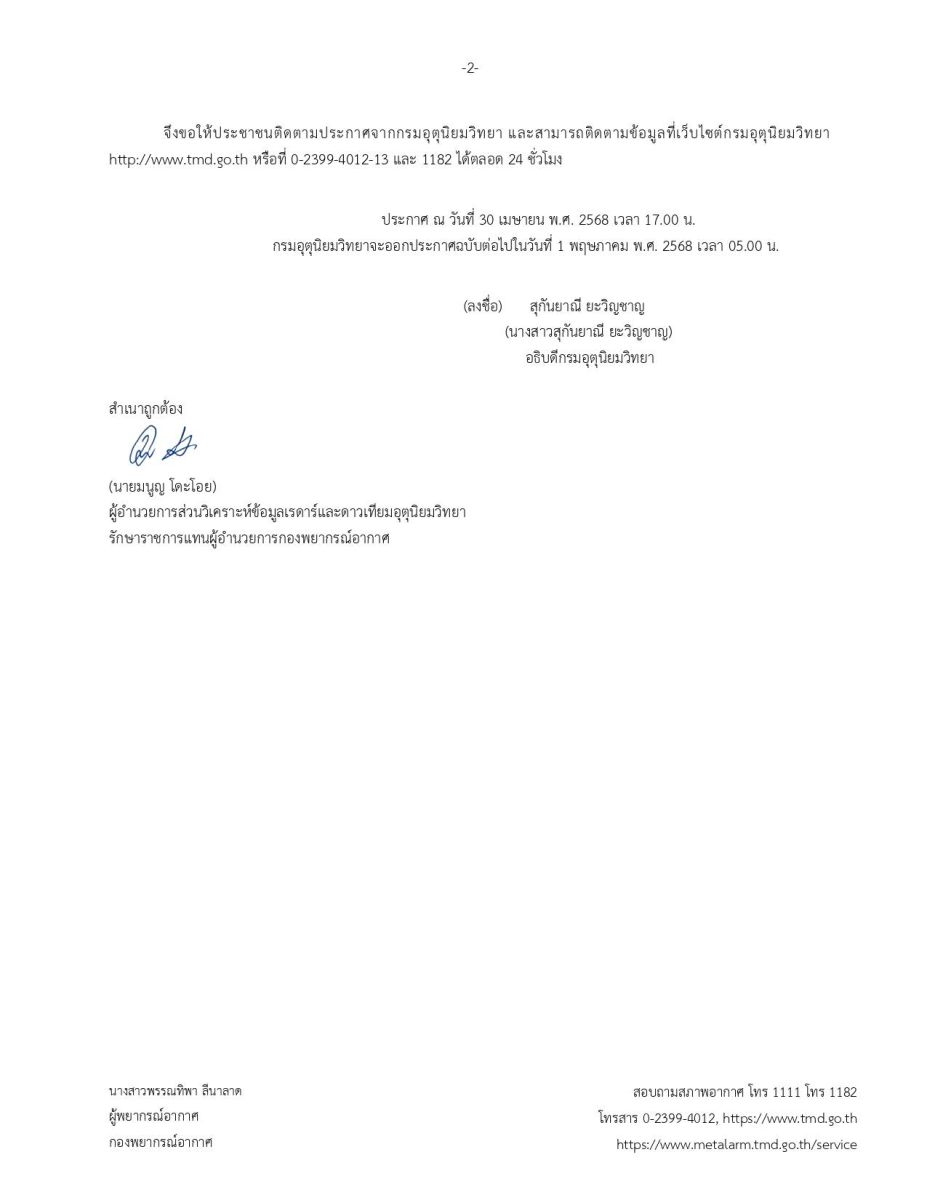 ประกาศกรมอุตุนิยมวิทยา เรื่อง พายุฤดูร้อนบริเวณประเทศไทยตอนบน (มีผลกระทบจนถึงวันที่ 1 พฤษภาคม 2568) ฉบับที่ 14 (107/2568) บริเวณภาคเหนือ ภาคตะวันออกเฉียงเหนือ และภาคกลางยังคงมีพายุฤดูร้อนเกิดขึ้น โดยมีลักษณะของพายุฝนฟ้าคะนอง ลมกระโชกแรง ลูกเห็บตก และฝนตกหนักบางแห่ง รวมถึงฟ้าผ่าที่อาจเกิดขึ้นได้บางพื้นที่ เนื่องจากบริเวณความกดอากาศสูง ได้แผ่ลงมาปกคลุมประเทศเวียดนามและ ทะเลจีนใต้ ทำให้มีแนวพัดสอบของลมตะวันออกเฉียงใต้และลมตะวันตกเฉียงใต้พัดปกคลุม ประเทศไทยตอนบน ในขณะที่ประเทศไทยตอนบนมีอากาศร้อน ประกอบกับมีคลื่นกระแสลมฝ่ายตะวันตกจากประเทศเมียนมา เคลื่อนเข้าปกคลุมภาคเหนือ และภาคตะวันออกเฉียงเหนือตอนบน ขอให้ประชาชนบริเวณดังกล่าวระวังอันตรายจากพายุฤดูร้อนและฝนตกหนักที่จะเกิดขึ้น โดยหลีกเลี่ยงอยู่ในที่โล่งแจ้ง ใต้ต้นไม้ใหญ่ สิ่งปลูกสร้าง และป้ายโฆษณาที่ไม่แข็งแรง สำหรับเกษตรกรควรเสริมความแข็งแรงให้ไม้ผล และเตรียมการป้องกันความเสียหายที่อาจเกิดขึ้นกับผลผลิตทางการเกษตรและสัตว์เลี้ยง จังหวัดที่คาดว่าจะได้รับผลกระทบ มีดังนี้