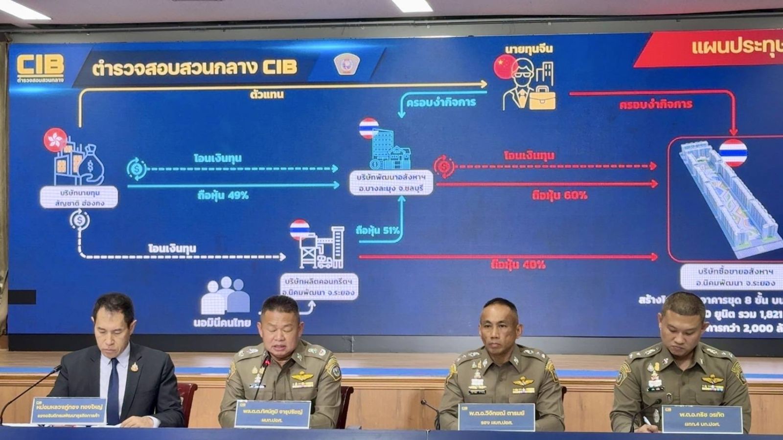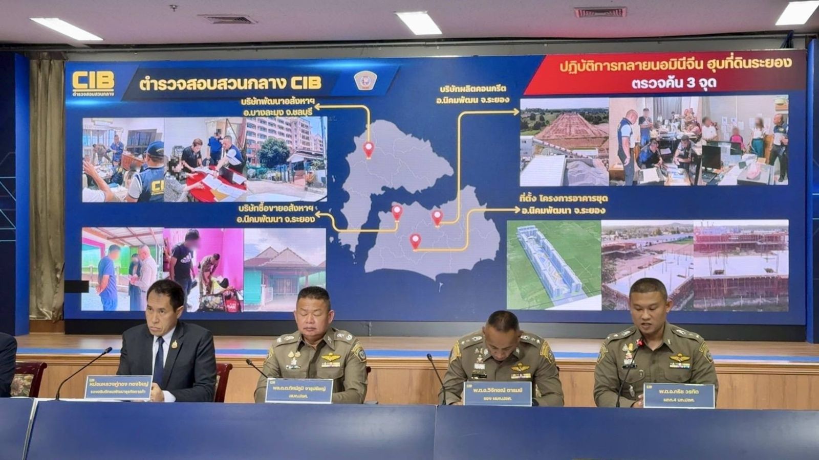 ต่อมากองบังคับการปราบปรามการกระทำความผิดเกี่ยวกับอาชญากรรมทางเศรษฐกิจ (บก.ปอศ.) และกรมพัฒนาธุรกิจการค้า ตรวจสอบพบกลุ่มนิติบุคคลไทย จำนวน 3 ราย ถือครองที่ดินและอสังหาริมทรัพย์ในพื้นที่จังหวัดระยองและชลบุรี มีพฤติกรรมนำบุคคลสัญชาติไทยมาเป็นตัวแทนอำพราง หรือที่เรียกว่า “นอมินี”เพื่อหลบเลี่ยงข้อกฎหมาย และการตรวจสอบของเจ้าหน้าที่รัฐ กองกำกับการ 4 กองบังคับการปราบปรามการกระทำความผิดเกี่ยวกับอาชญากรรมทางเศรษฐกิจ ได้ทำการสืบสวนสอบสวน กลุ่มนิติบุคคลทั้ง 3 รายดังกล่าว พบว่ากลุ่มบริษัทดังกล่าวเริ่มจดทะเบียนในช่วงปี2566-2567 โดยมีวัตถุประสงค์ผลิตและจำหน่ายวัสดุก่อสร้าง และดำเนินกิจการเกี่ยวกับอสังหาริมทรัพย์มีโครงสร้างผู้ถือหุ้นที่ซับซ้อน มีการใช้พนักงานคนไทย เช่น พนักงานฝ่ายขาย คนขับรถตักดิน มาถือหุ้นและเป็นกรรมการ โดยไม่ได้ลงทุนจริงและไม่มีบทบาทในการบริหารแต่อย่างใด ซึ่งหลังจากจดทะเบียนจัดตั้งบริษัทแล้ว บริษัทได้กว้านซื้อที่ดินในพื้นที่ อำเภอนิคมพัฒนา จังหวัดระยอง และ อำเภอบางละมุง จังหวัดชลบุรี จำนวน 7 แปลง รวมเนื้อที่กว่า 72 ไร่ เพื่อนำมาสร้างเป็นที่ตั้งบริษัทและโครงการที่พักอาศัย ในลักษณะอาคารชุด 8 ชั้น จำนวน 10 อาคาร เป็นห้องพักอาศัยกว่า 1,821 ห้อง รวมมูลค่าโครงการกว่า 2,000 ล้านบาท ซึ่งปัจจุบันโครงการดังกล่าวอยู่ระหว่างก่อสร้าง