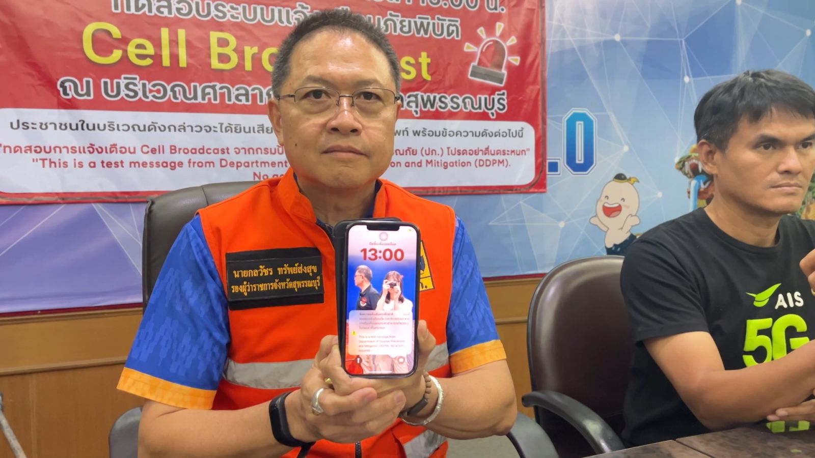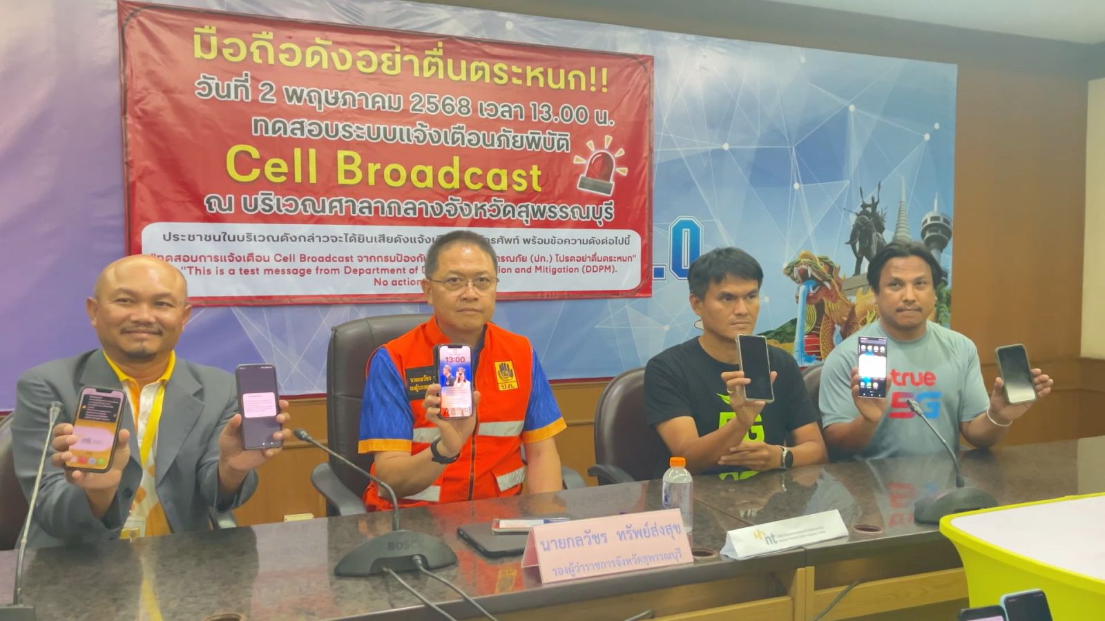 สำหรับการทดสอบบริเวณพื้นที่ศาลากลางจังหวัดสุพรรณบุรีในวันนี้ เป็นการแจ้งเตือนข้อความผ่านระบบ Cell Broadcast ว่า “ทดสอบแจ้งเตือนภัย Cell Broadcast จากกรมป้องกันและบรรเทาสาธารณภัย (ปภ.) โปรดอย่าตื่นตระหนก This is a test message from Department of Disaster Prevention and Mitigation (DDPM). No action required.” ตรงเข้าโทรศัพท์มือถือทุกเครื่องที่อยู่ในบริเวณศาลากลางจังหวัดสุพรรณบุรี รัศมีครอบคลุม 1.8 กิโลเมตร โดยมีเสียงสัญญาณดังขึ้นแม้โทรศัพท์จะปิดเสียง การทดลองส่งข้อความผ่านระบบ Cell Broadcast หรือ (CB) เป็นระบบที่ใช้วิธีการส่งข้อความแจ้งเตือนภัยไปยังโทรศัพท์เคลื่อนที่ทุกเครื่องผ่านเครือข่ายเซลลูลาร์ของระบบโทรคมนาคมในระยะเวลาสั้น โดยไม่ต้องทราบหมายเลขโทรศัพท์ของผู้รับ และไม่ต้องลงทะเบียนล่วงหน้า เพื่อยกระดับการแจ้งเตือนพี่น้องประชาชนเมื่อเกิดภัยพิบัติ อุบัติภัย เช่น แผ่นดินไหว ดินโคลนถล่ม น้ำท่วม หรืออุบัติเหตุใหญ่ ๆ ที่มีความจำเป็นต้องแจ้งเตือนประชาชน