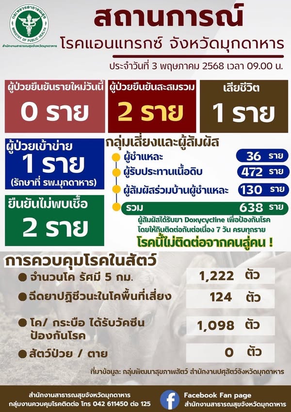 3 พฤษภาคม 2568 นายแพทย์ณรงค์ จันทร์แก้ว สาธารณสุขจังหวัดมุกดาหาร เปิดเผยถึงสถานการณ์ผู้ป่วยโรคแอนแทรกซ์ในพื้นที่จังหวัดมุกดาหาร หลังพบผู้ป่วยเป็นโรคแอนแทรกซ์ เสียชีวิต 1 ราย ซึ่งตอนนี้จำนวนผู้ป่วยเข้าข่ายเป็นโรคแอนแทรกซ์มี 3 ราย ได้เข้ารับการรักษาในโรงพยาบาล โดยผลการตรวจเชื้อ RT-PCR ของผู้ป่วย 2 ราย ยืนยันออกมาเป็นที่เรียบร้อยว่าไม่พบเชื้อ และมีผู้ป่วยที่ยังคงรักษาตัว 1 ราย ไม่พบผู้ป่วยรายใหม่เพิ่ม