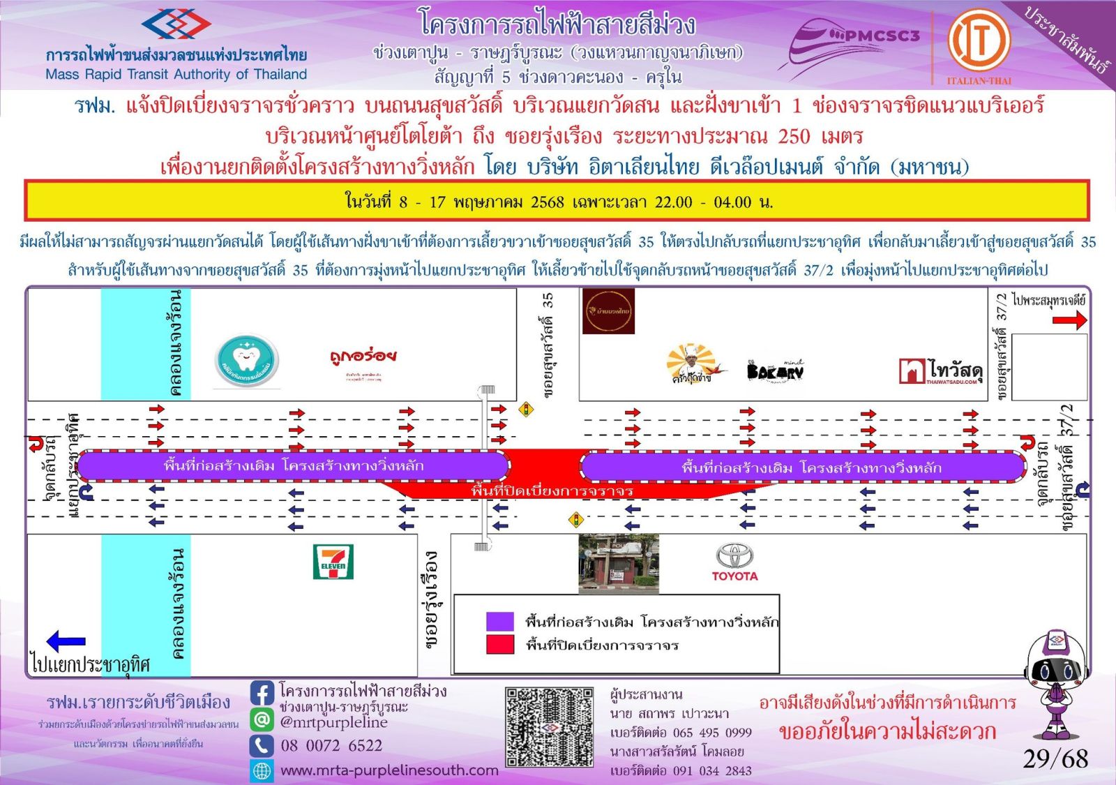 การรถไฟฟ้าขนส่งมวลชนแห่งประเทศไทย (รฟม.) แจ้งว่า บริษัท อิตาเลียนไทย ดีเวล๊อปเมนต์ จำกัด (มหาชน) ผู้รับจ้างงานก่อสร้างทางวิ่งและสถานียกระดับ อาคารจอดรถไฟฟ้าและอาคารจอดแล้วจร โครงการรถไฟฟ้าสายสีม่วง ช่วงเตาปูน - ราษฎร์บูรณะ (วงแหวนกาญจนาภิเษก) สัญญาที่ 5 ช่วงดาวคะนอง - ครุใน มีความจำเป็นต้องปิดเบี่ยงจราจรชั่วคราว บนถนนสุขสวัสดิ์ บริเวณแยกวัดสน และฝั่งขาเข้า 1 ช่องจราจร ชิดแนวแบริเออร์ บริเวณหน้าศูนย์โตโยต้า ถึง ซอยรุ่งเรือง ระยะทางประมาณ 250 เมตร เพื่องานยกติดตั้งโครงสร้างทางวิ่งหลัก ระหว่างวันที่ 8 – 17 พฤษภาคม 2568 เฉพาะเวลา 22.00 – 04.00 น. โดยมีผลให้ไม่สามารถสัญจรผ่านแยกวัดสนได้ โดยผู้ใช้เส้นทาง ฝั่งขาเข้าที่ต้องการเลี้ยวขวาเข้าซอยสุขสวัสดิ์ 35 ให้ตรงไปกลับรถที่แยกประชาอุทิศ เพื่อกลับมาเลี้ยวเข้าสู่ซอยสุขสวัสดิ์ 35 สำหรับผู้ใช้เส้นทางจากซอยสุขสวัสดิ์ 35 ที่ต้องการมุ่งหน้าไปแยกประชาอุทิศ ให้เลี้ยวซ้ายไปใช้จุดกลับรถหน้าซอยสุขสวัสดิ์ 37/2 เพื่อมุ่งหน้าไปแยกประชาอุทิศต่อไป