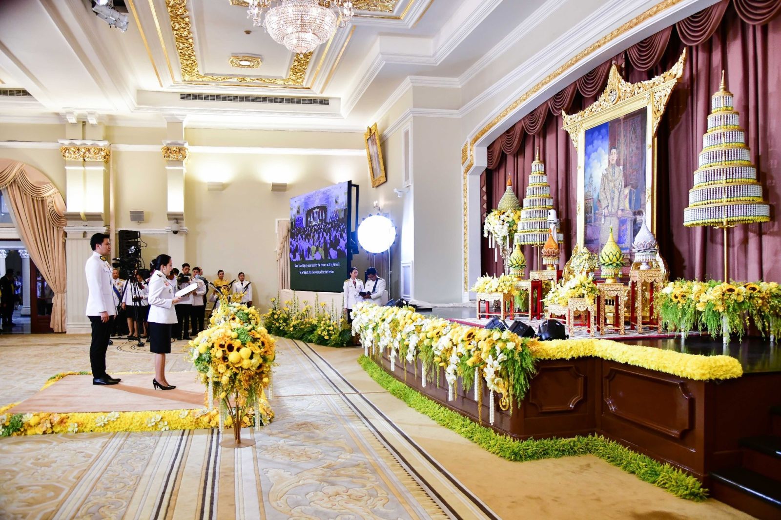 โอกาสนี้ เมื่อนายกรัฐมนตรีและคู่สมรสเดินทางมาถึงตึกสันติไมตรี (หลังนอก) นายกรัฐมนตรีถวายคำนับ พระบรมสาทิสลักษณ์พระบาทสมเด็จพระเจ้าอยู่หัว และถวายธูปเทียนแพ แล้วถวายคำนับ 1 ครั้ง จากนั้น นายกรัฐมนตรีได้กล่าวถวายพระพรชัยมงคล ใจความว่า