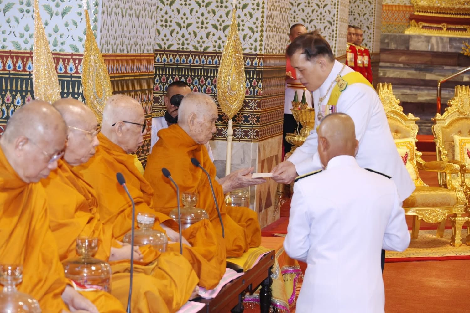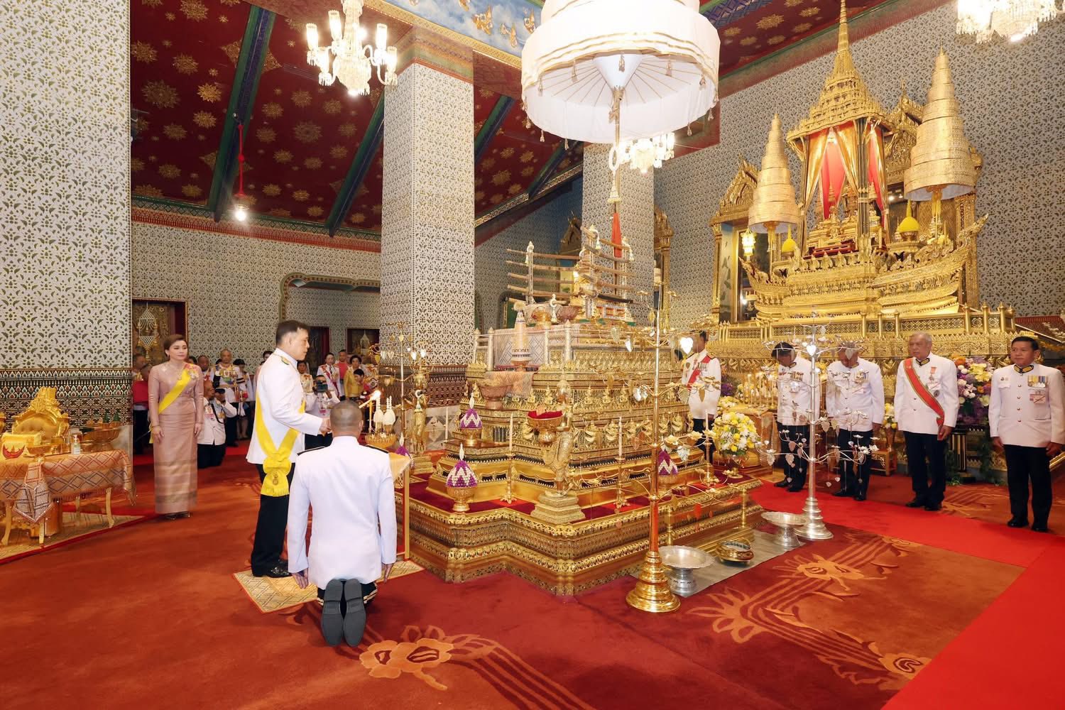 ครั้นเสด็จพระราชดำเนินถึง พระบาทสมเด็จพระเจ้าอยู่หัว ทรงจุดธูปเทียนเครื่องนมัสการพานทองสองชั้นบูชาพระพุทธปฏิมาชัยวัฒน์ รัชกาลที่ ๑ ถึงรัชกาลที่ ๗ และรัชกาลที่ ๙ ที่หน้าพระที่นั่งบุษบกมาลา ทรงกราบ ทรงศีล สมเด็จพระอริยวงศาคตญาณ สมเด็จพระสังฆราช สกลสังฆปริณายก ถวายศีล และพระสงฆ์ถวายพรพระ จบแล้ว เสด็จพระราชดำเนินไปทรงประเคนปิ่นโตภัตตาหารแด่ สมเด็จพระอริยวงศาคตญาณ สมเด็จพระสังฆราช สกลสังฆปริณายก ประธานสงฆ์ นอกนั้น ทรงพระกรุณาโปรดเกล้าโปรดกระหม่อมให้พระราชวงศ์ องคมนตรี และข้าราชการชั้นผู้ใหญ่ ทรงประเคน และประเคน จนครบ ๒๐ รูป เสร็จแล้ว ทรงประเคนจตุปัจจัยไทยธรรมแด่ สมเด็จพระราชาคณะ พระราชาคณะ เจ้าคณะรอง และพระราชาคณะ จนครบ ๒๐ รูป ทรงหลั่งทักษิโณทก พระสงฆ์ถวายอนุโมทนา ถวายอดิเรก ถวายพระพรลา จากนั้น เสด็จพระราชดำเนินไปทรงจุดธูปเทียนเครื่องทองน้อยบูชาเทวดาที่รักษาพระนพปฎลมหาเศวตฉัตร เครื่องราชกกุธภัณฑ์ ทรงคม พราหมณ์เบิกแว่นเวียนเทียนสมโภชพระนพปฎลมหาเศวตฉัตร เครื่องราชกกุธภัณฑ์ ครบ ๓ รอบ พระมหาราชครูพิธีศรีวิสุทธิคุณ ประธานพระครูพราหมณ์ เจิมพระนพปฎลมหาเศวตฉัตร โหรหลวงผูกผ้าสีชมพู เสร็จแล้ว พระบาทสมเด็จพระเจ้าอยู่หัว เสด็จพระราชดำเนินไปทรงพระสุหร่ายเครื่องราชกกุธภัณฑ์ และพระราชลัญจกรพระครุฑพ่าห์ทองคำประจำรัชกาลที่พระแท่นพระนพปฎลมหาเศวตฉัตร แล้วทรงกราบพระพุทธปฏิมาชัยวัฒน์ รัชกาลที่ ๑ ถึงรัชกาลที่ ๗ และรัชกาลที่ ๙ ที่หน้าพระที่นั่งบุษบกมาลา ทรงรับการถวายความเคารพของผู้มาเฝ้าทูลละอองธุลีพระบาท แล้วเสด็จออกจากพระที่นั่งอมรินทรวินิจฉัย ประทับรถยนต์พระที่นั่ง เสด็จพระราชดำเนินกลับ