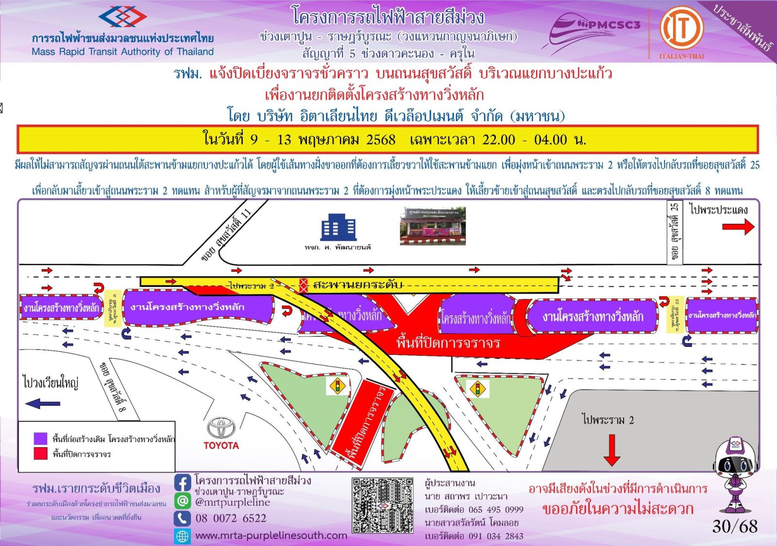 โดยผู้ใช้เส้นทางสามารถสอบถามรายละเอียดการปิดเบี่ยงจราจรได้ที่หมายเลข 08 0072 6522 และติดตามข้อมูลโครงการฯ ได้ที่ เว็บไซต์ www.mrta-purplelinesouth.com Facebook โครงการรถไฟฟ้าสายสีม่วง ช่วงเตาปูน – ราษฎร์บูรณะ และ Line @mrtpurpleline