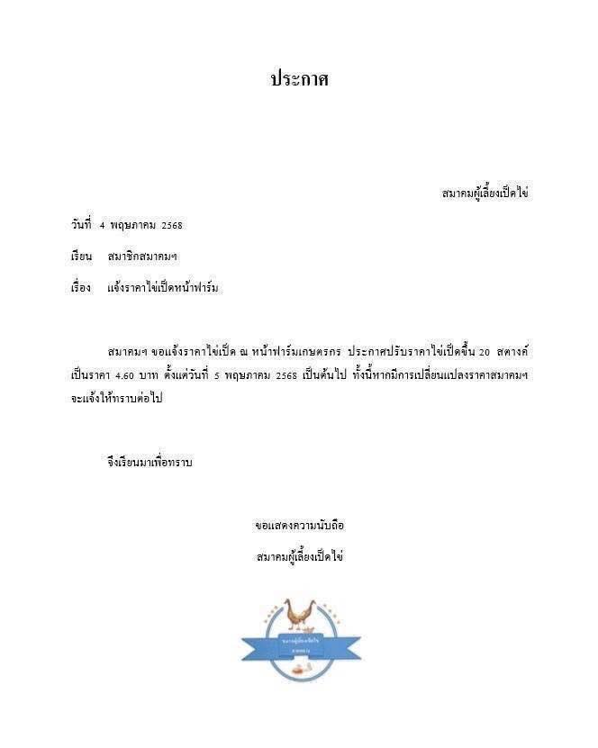 เมื่อวันที่ 4 พฤษภาคม 2568 สมาคมผู้เลี้ยงเป็ดไข่ ได้ออกประกาศแจ้งราคาไข่เป็ดหน้าฟาร์ม โดยระบุว่า สมาคม ขอแจ้งราคาเป็ด ณ หน้าฟาร์มเกษตรกร ประกาศปรับราคาไข่เป็ดขึ้น 20 สตางค์ เป็นราคา 4.60 บาทต่อฟอง หรือแผงละ 6 บาท ตั้งแต่วันที่ 5 พฤษภาคม 2568 เป็นต้นไป ทั้งนี้หากมีการเปลี่ยนแปลงราคาสมาคมจะแจ้งให้ทราบต่อไป