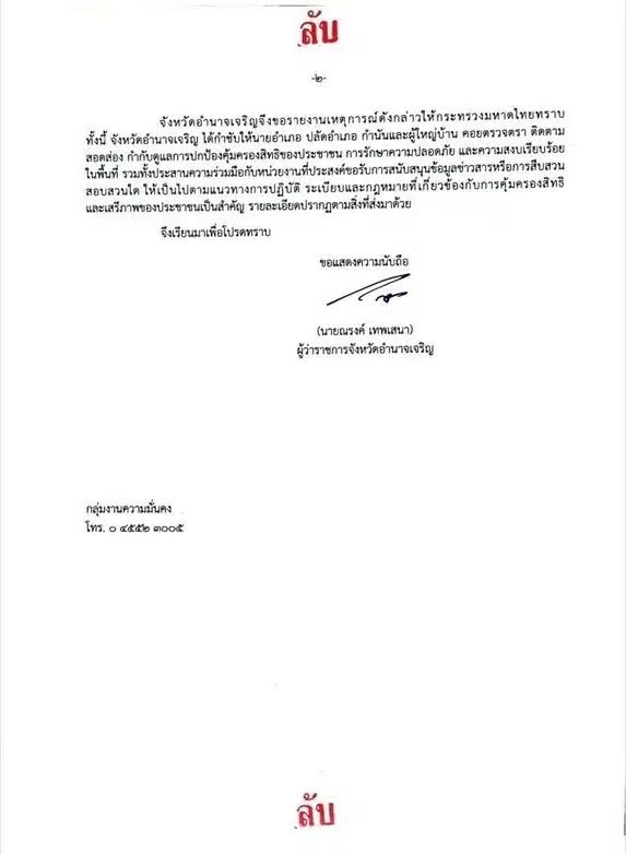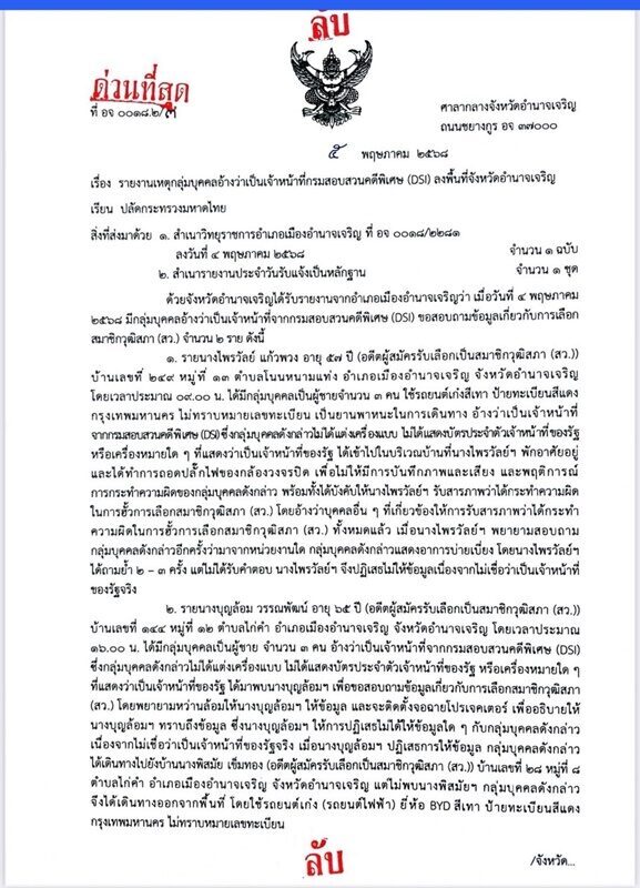 6 พฤษภาคม 2568 จากกรณี นายณรงค์ เทพเสนา ผวจ.อำนาจเจริญ ทำหนังสือลับ ด่วนที่สุด ที่ อจ 0018.2/3 ถึงปลัดกระทรวงมหาดไทย เรื่อง รายงานเหตุกลุ่มบุคคลอ้างว่าเป็นเจ้าหน้าที่กรมสอบสวนคดีพิเศษ (DSI) ลงพื้นที่จังหวัดอำนาจเจริญ ขอสอบถามข้อมูลเกี่ยวกับการเลือกสมาชิกวุฒิสภา (สว.) 2 ราย ซึ่งกลุ่มบุคคลดังกล่าวไม่ได้แต่งเครื่องแบบ ไม่ได้แสดงบัตรประจำตัวเจ้าหน้าที่ของรัฐ หรือเครื่องหมายใด ๆ ได้เข้าไปในบ้านของอดีตผู้สมัคร สว. และถอดปลั๊กไฟของกล้องวงจรปิด บังคับให้อดีตผู้สมัคร สว. รับสารภาพว่าได้กระทำความผิดในการฮั้วการเลือกสมาชิกวุฒิสภา (สว.)