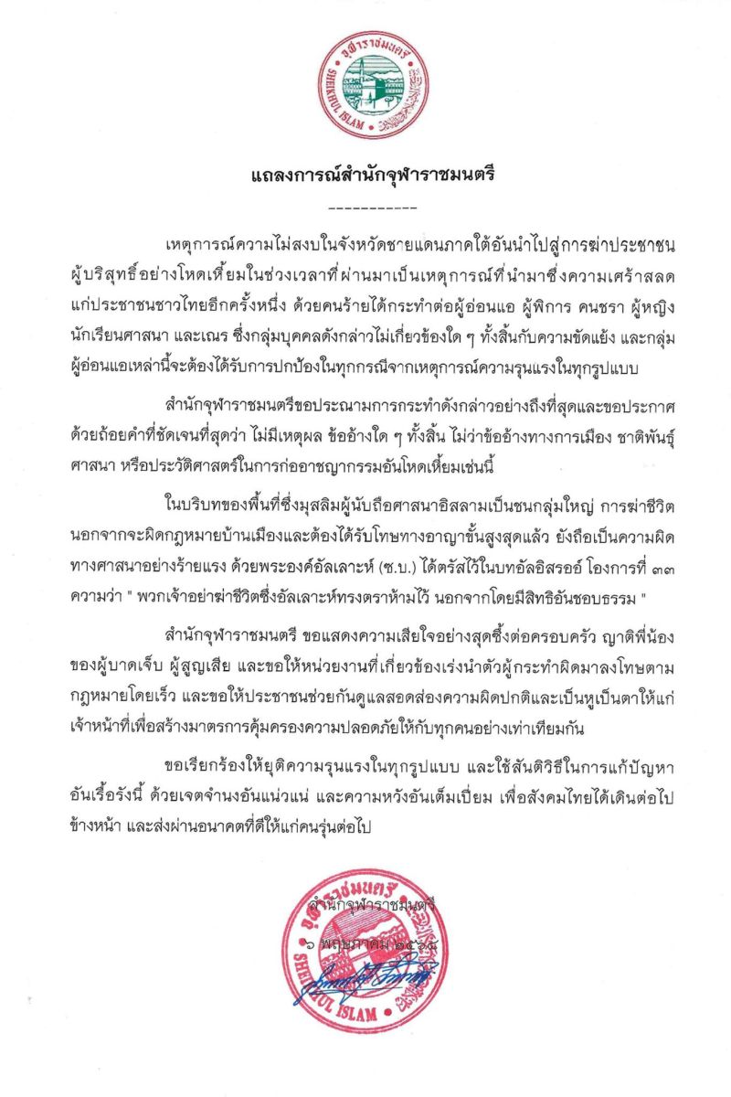 สำนักจุฬาราชมนตรี ออกแถลงการณ์ แสดงความเสียใจอย่างสุดซึ้ง กรณีเหตุการณ์ความไม่สงบในจังหวัดชายแดนภาคใต้