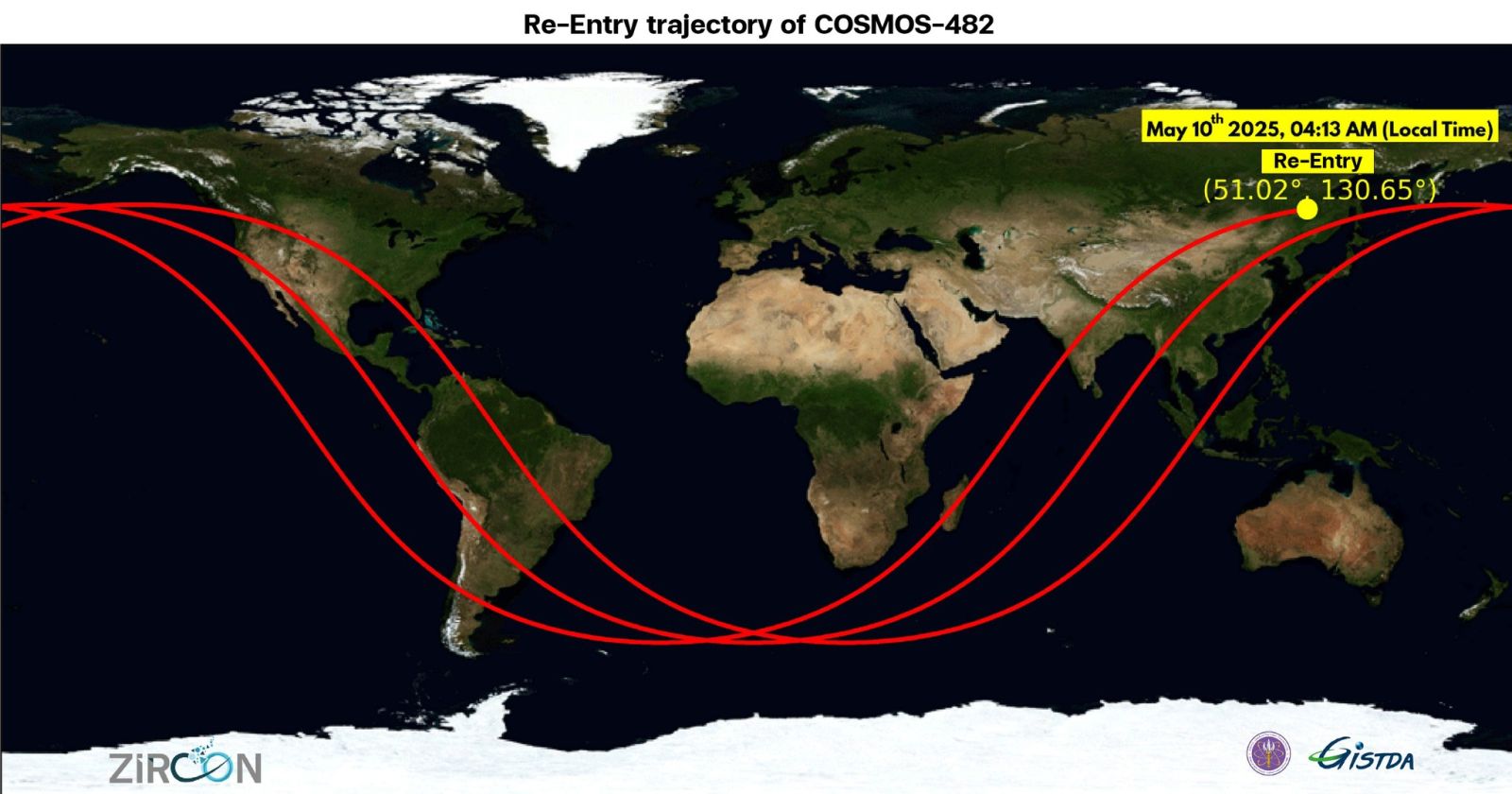 8 พฤษภาคม 2568 สำนักงานพัฒนาเทคโนโลยีอวกาศและภูมิสารสนเทศ (องค์การมหาชน) หรือ GISTDA โดยศูนย์วิจัยเทคโนโลยีอวกาศ แจ้งเตือนล่าสุด (7 พ.ค. 2568) ระบุ "ขณะนี้ยานอวกาศ COSMOS 482 โคจรห่างจากพื้นโลกในระยะใกล้โลกโดยเฉลี่ยประมาณ 150 กิโลเมตร (ตามแนวการโคจรที่ปรากฏเป็นเส้นสีแดงดังภาพ) และมีแนวโน้มจะตกในช่วงวันที่ 10 พฤษภาคม 2568 เวลา 4 นาฬิกา 13 นาที ตามเวลาในประเทศไทย ซึ่งจากการวิเคราะห์ ณ วันนี้ จุดที่คาดว่าจะเป็นจุดตกของชิ้นส่วนยานอวกาศฯ จะอยู่ในพื้นที่ของประเทศรัสเซีย