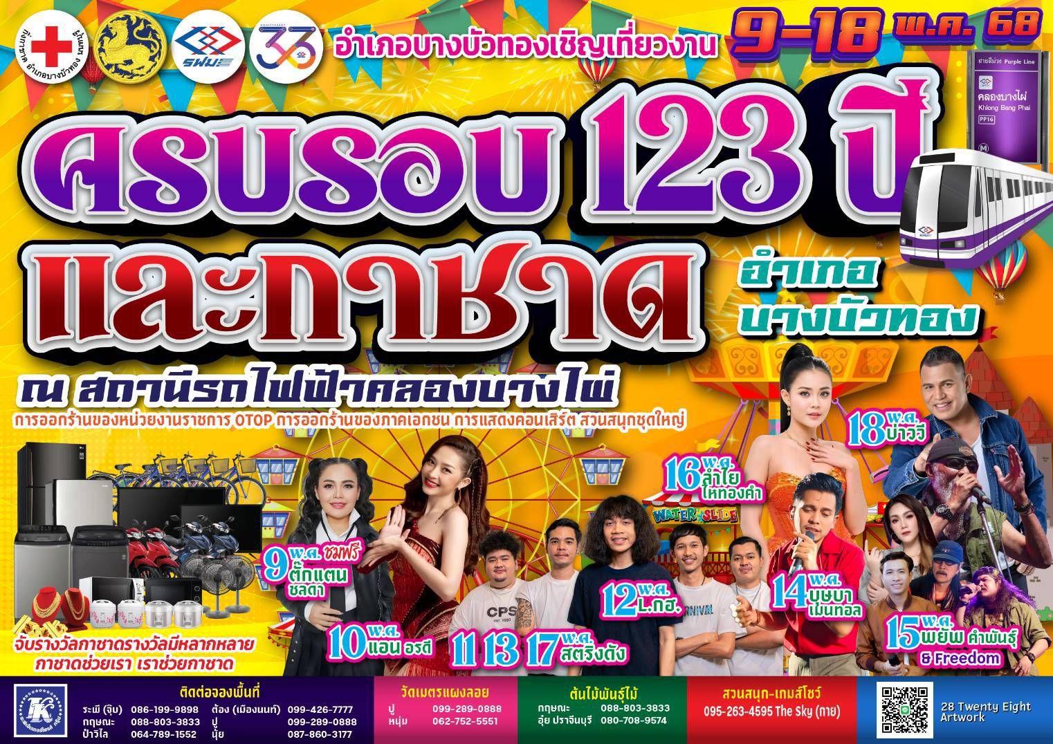 การรถไฟฟ้าขนส่งมวลชนแห่งประเทศไทย (รฟม.) ร่วมกับอำเภอบางบัวทอง จังหวัดนนทบุรี จัดงานครบรอบ 123 ปี อำเภอบางบัวทอง และงานกาชาดอำเภอบางบัวทองประจำปี 2568” ระหว่างวันที่ 9-18 พฤษภาคม 2568 ตั้งแต่เวลา 14.00 - 00.00 น. ณ สถานีคลองบางไผ่ (บริเวณถนนด้านหน้าอาคารจอดแล้วจรจนถึงบริเวณพื้นที่ด้านหลังศูนย์ซ่อมบำรุง) รถไฟฟ้ามหานคร สายฉลองรัชธรรม (MRT สายสีม่วง)