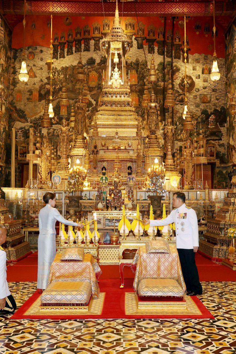 โอกาสนี้ ทรงรับกระทงดอกไม้จากเจ้าพนักงานพระราชพิธี แล้วทรงวางบนพานหน้าฐานชุกชี ทรงจุดธูปเทียนเครื่องนมัสการท้ายที่นั่ง ทรงจุดเทียนห่วงบูชาพระพุทธมหามณีรัตนปฏิมากร จากนั้น ทรงจุดธูปเทียนเครื่องนมัสการท้ายที่นั่งบูชาพระพุทธยอดฟ้าจุฬาโลกย์ และพระพุทธเลิศหล้านภาไลย เสร็จแล้ว พระบาทสมเด็จพระเจ้าอยู่หัว ทรงจุดธูปเทียนเครื่องนมัสการทองใหญ่ที่หน้าธรรมาสน์ศิลา สมเด็จพระนางเจ้า ฯ พระบรมราชินี ทรงจุดธูปเทียนเครื่องนมัสการทองทิศที่หน้าธรรมาสน์ศิลา ทรงศีล เมื่อพระราชวชิรโมลี ผู้ช่วยเจ้าอาวาสวัดระฆังโฆสิตาราม ประธานสงฆ์ถวายศีล จบ เสด็จพระราชดำเนินไปที่ธรรมาสน์ศิลา ทรงพระสุหร่ายสรงพระพุทธปฏิมาชัยวัฒน์ รัชกาลที่ 9, พระคันธารราษฎร์องค์ใหญ่ รัชกาลที่ 10, พระคันธารราษฎร์จีนนั่ง รัชกาลที่ 10, พระคันธารราษฎร์จีนยืน รัชกาลที่ 10, พระคันธารราษฎร์บันได รัชกาลที่ 10, พระคันธารราษฎร์รวงข้าว รัชกาลที่ 10, พระบัวเข็ม, พระพลเทพ, พระโคศุภราช และทรงประพรมพืชต่าง ๆ ซึ่งตั้งอยู่บนโต๊ะ 2 ข้างนั้นด้วย แล้วทรงโปรยดอกไม้และถวายพวงมาลัยที่พระพุทธรูปทุกองค์