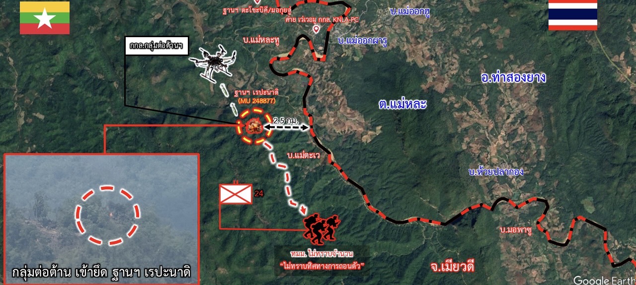 9 พ.ค.68 เวลา 10.50 กองกำลัง KNLA พล.น.7 สามารถเข้ายึดที่ตั้งของ ทหารเมียนมา พัน.ร.24 ฐานเรปะนาดิ ได้สำเร็จ หลังจากมีการสู้รบในห้วง 3 วันที่ผ่านมา ตลอดทั้งกลางวัน และกลางคืน โดยทหารเมียนมาฐานเรปะนาดิ ได้ถอนตัวออกจากฐาน และ กองกำลัง KNLA ได้เข้าตรวจสอบฐานฯ และยึดอาวุธยุทโธปกรณ์ได้จำนวนหนึ่ง และทำการเผาทำลายอาคารที่พักบนฐานเรปะนาดิ