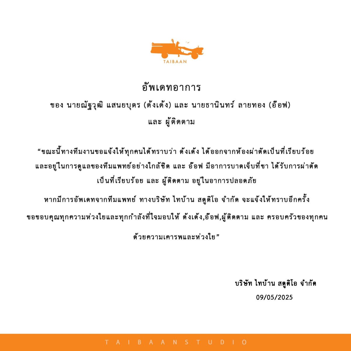 ขณะที่ทางทีมงานขอแจ้งให้ทุกคนทราบว่า ด้งเด้ง ได้ออกจากห้องผ่าตัดเป็นที่เรียบร้อยและอยู่ในการดูแลของทีมแพทย์อย่างใกล้ชิด และอ๊อฟ มีอาการบาดเจ็บที่ขา ได้รับการผ่าตัดเป็นที่เรียบร้อย และผู้ติดตามอยู่ในอาการปลอดภัย