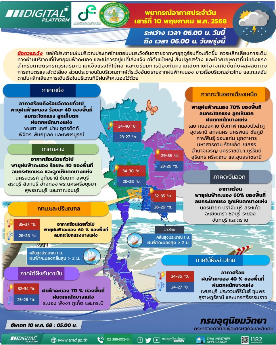 ลักษณะอากาศทั่วไป พยากรณ์อากาศ 24 ชั่วโมงข้างหน้า ภาคตะวันออกเฉียงเหนือจะมีพายุ ฤดูร้อนเกิดขึ้น โดยมีลักษณะของพายุฝนฟ้าคะนอง ลมกระโชกแรง และลูกเห็บตกบางแห่ง รวมถึงฟ้าผ่าที่อาจเกิดขึ้นได้บางพื้นที่ ส่วนภาคอื่นๆ จะได้รับผลกระทบในระยะถัดไป ทั้งนี้เนื่องจากบริเวณความกดอากาศสูงกำลังปานกลางจากประเทศจีนแผ่ลงมาปกคลุมประเทศเวียดนามและทะเลจีนใต้ ส่งผลทำให้มีลมตะวันออกเฉียงใต้และลมใต้พัดนำความชื้นจากอ่าวไทย และทะเลจีนใต้เข้าปกคลุมประเทศไทยตอนบน