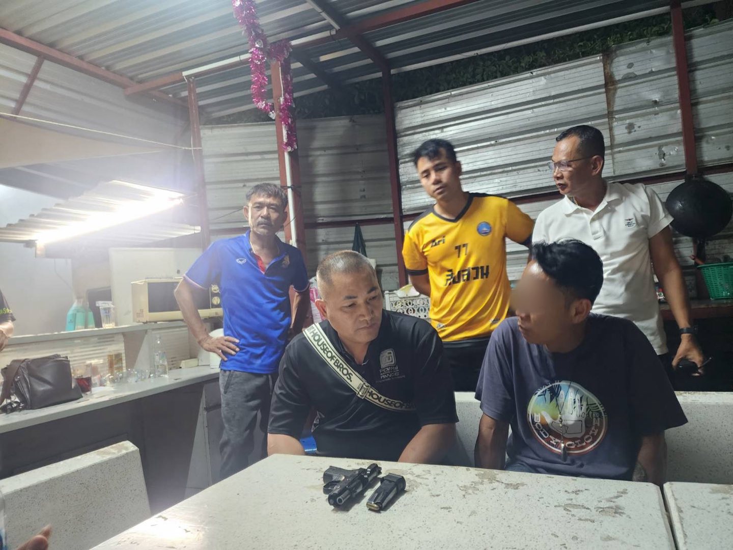 จากการสอบถามรับและยินยอมนำอาวุธปืน (ไม่มีทะเบียน) มอบให้กับเจ้าหน้าที่ตำรวจหลังโยนทิ้งไว้ข้างบ้าน พร้อมให้ถ้อยคำว่าเป็นผู้ก่อเหตุ ใช้อาวุธปืนยิง ผู้ตายเสียชีวิต เนื่องจากถูกผู้ตาย มีอาการลักษณะเมาสุราไล่ยิงก่อนจึงใช้อาวุธปืนยิงตอบโต้กัน แล้วทำให้ถึงแก่ความตาย แล้วหลบหนีไป ภายหลังจึงเดินทางมาพบกับเจ้าหน้าที่ตำรวจพร้อมส่งมอบอาวุธปืนให้ดำเนินคดีตามกฎหมาย ทั้งนี้ พนักงานสอบสวนได้ติดต่อเจ้าหน้าที่ พฐ. มาตรวจพาราฟินเทสที่ร่างกายและเก็บเสื้อผ้าของกลางนำส่งตรวจพิสูจน์ต่อไป
