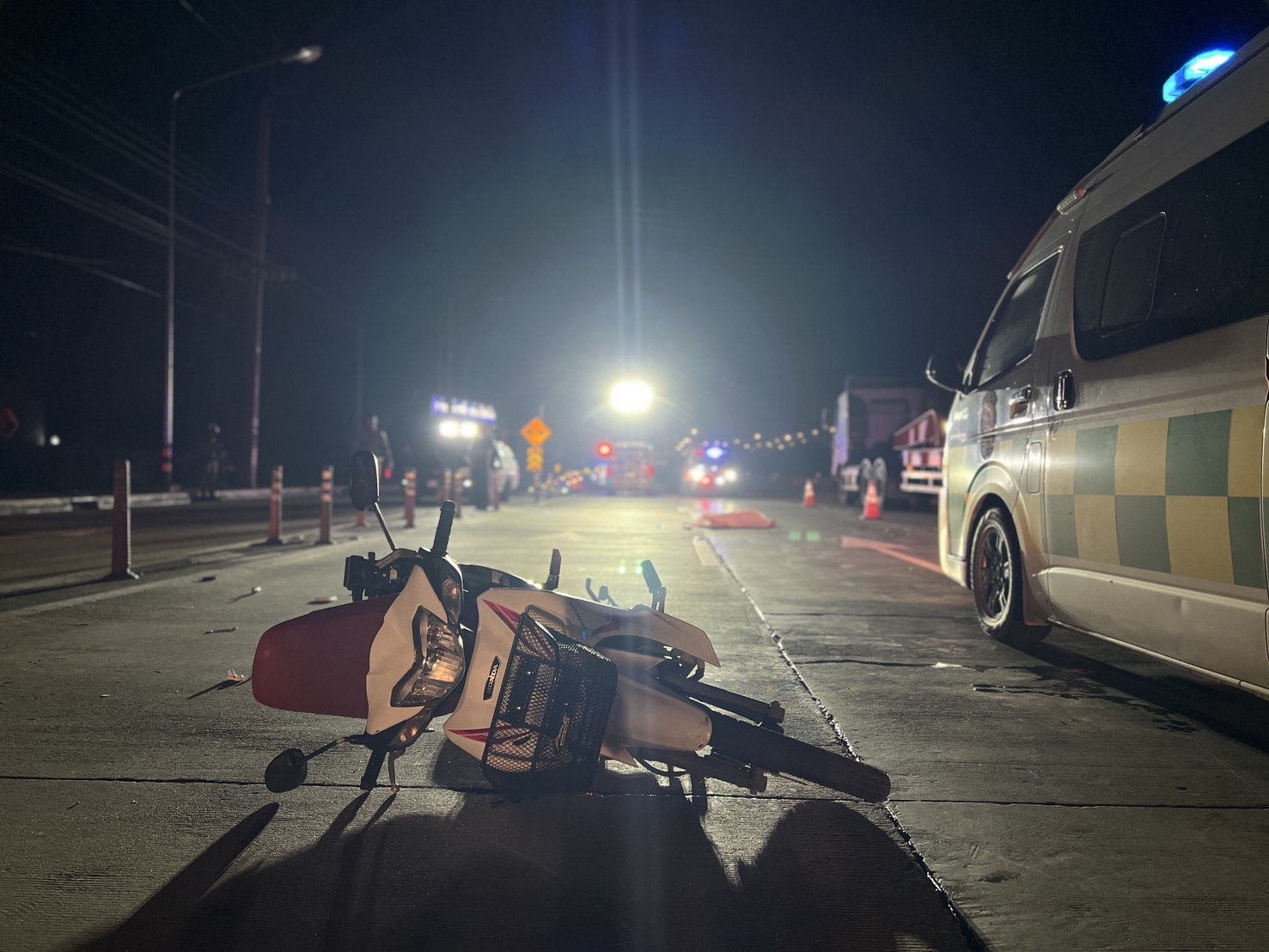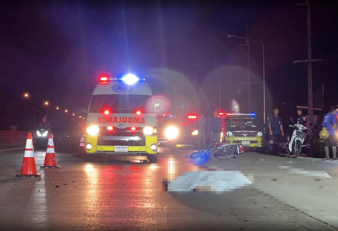เมื่อเวลา 01:45 น.วันที่ 11 พ.ค.68 เจ้าหน้าที่ตำรวจสภ. ชัยพฤกษ์ พร้อมเจ้าหน้าที่มูลนิธิป่อเต็กตึ๊ง สมาคมกู้ชีพบัวเพชรนนทบุรี เดินทางเข้าตรวจสอบหลังจากได้รับแจ้งมีรถจักรยานยนต์ถูกรถยนต์กระบะชนเสียชีวิต เหตุเกิดถนนทางหลวงหมายเลข 9 (บางบัวทอง-บางปะอิน) ก่อนข้ามคลองพระอุดม ต.คลองข่อย อ.ปากเกร็ด จากนั้นจึงประสานแพทย์เวรจากสถาบันนิติวิทยาศาสตร์ร่วมตรวจสอบ