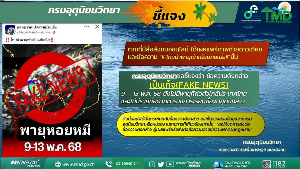 “กรมอุตุนิยมวิทยาขอชี้แจงว่าข้อความดังกล่าวเป็นเท็จ (Fake News) 9-13 พ.ค. 68 ยังไม่มีพายุที่ก่อตัวใกล้ประเทศไทย และไม่มีรายชื่อตามตารางการเรียกชื่อพายุดังกล่าว