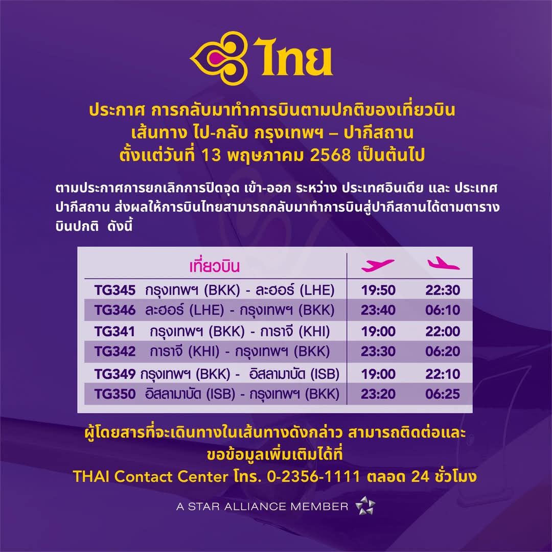 ตามที่ ประเทศอินเดียประกาศยกเลิกการปิดจุดเข้า-ออก ระหว่างอินเดียและปากีสถาน ส่งผลให้ บริษัท การบินไทย จำกัด (มหาชน) สามารถทำการบินระหว่างกรุงเทพฯ-ปากีสถาน (การาจี ละฮอร์ และอิสลามาบัด) ได้ตามตารางการบินปกติ ตั้งแต่วันที่ 13 พฤษภาคม 2568 เป็นต้นไป