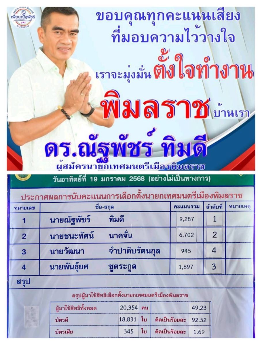 ดร.ณัฐพัชร์ ทิมดี นายกเทศมนตรีเมืองพิมลราช กล่าวว่า วันนี้ทีมงาน กลุ่มเพื่อนณัฐพัชร์ รู้สึกดีใจมากที่สามารถล้มแชมป์เก่าที่เขาครองตำแหน่งมายาวนาน 30 ปี การเลือกตั้งครั้งนี้ทีมของตนมีความประสงค์ที่จะเข้ามาพัฒนาเทศบาลเมืองพิมลราชให้เจริญก้าวหน้า ซึ่งประชาชนชาวพิมลราชไว้วางใจให้ทรมตนเข้ามาบริหารงาน โดยตนได้รับตำแหน่งเป็นนายกเทศมนตรีเมืองพิมลราชไปก่อนหน้าเมือง 2 เดือนที่ผ่านมา และสามารถนำทีมสมาชิกเข้ามารับใช้ประชาชนได้ยกทีม 18 คน ซึ่งถือว่าประสบความสำเร็จในการมุ่งมั่นที่จะทำให้เทศบาลเมืองพิมลราชเจริญยิ่งขึ้น วันนี้จึงได้พาทีมสมาชิกสภาเทศบาลมาสักการะสิ่งศักดิ์เพื่อเป็นสิริมงคลก่อนเข้ารับตำแหน่ง