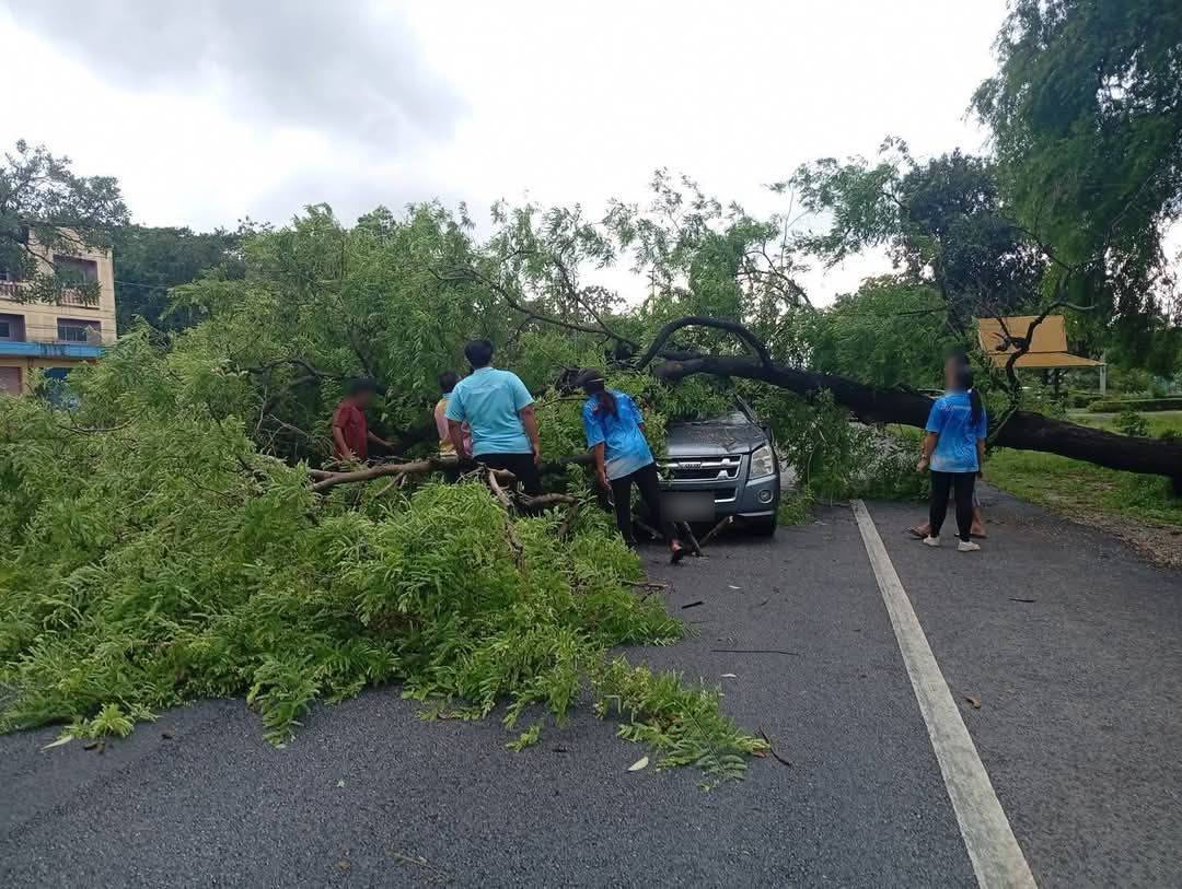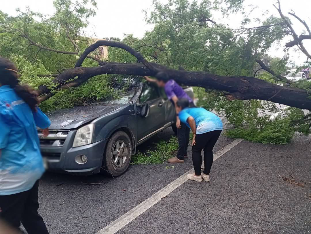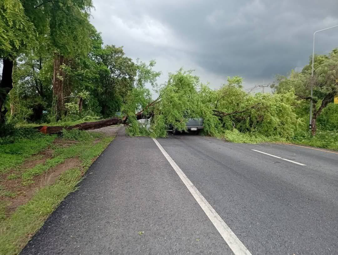 ลมพายุฝนกระหน่ำ ต้นไม้ล้มทับรถยนต์ขณะวิ่งบนถนนโชคดีไร้บาดเจ็บ เจ้าหน้าที่เร่งดำเนินตัดกิ่งไม้เคลื่อนย้ายเปิดทาง จ.พิษณุโลก