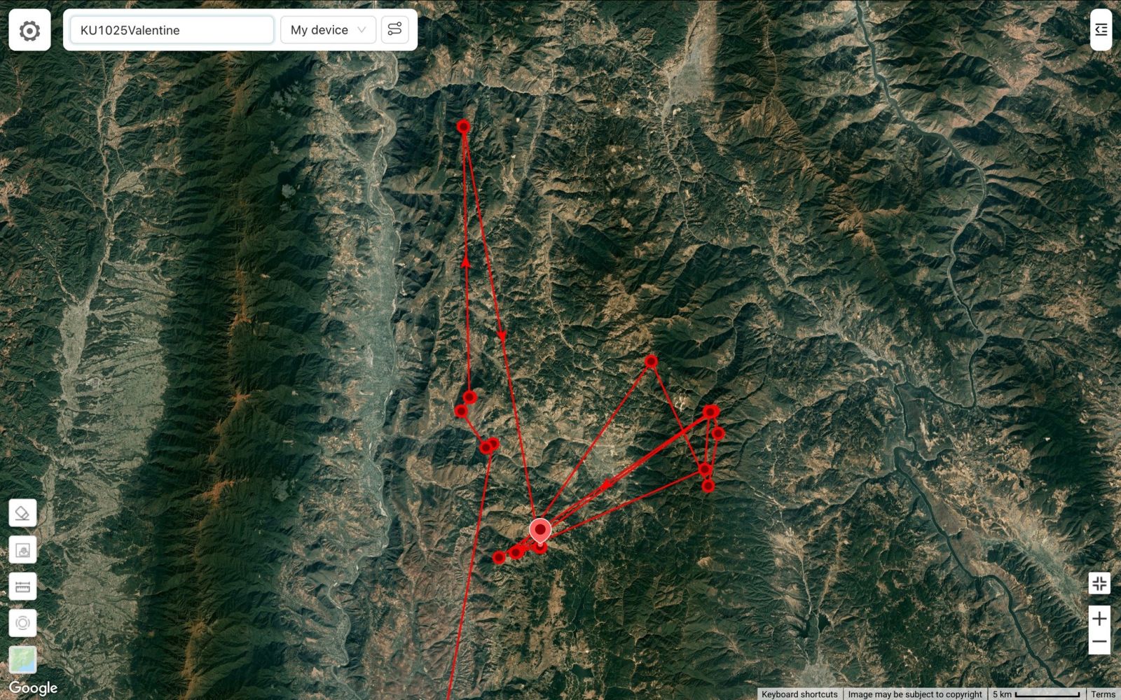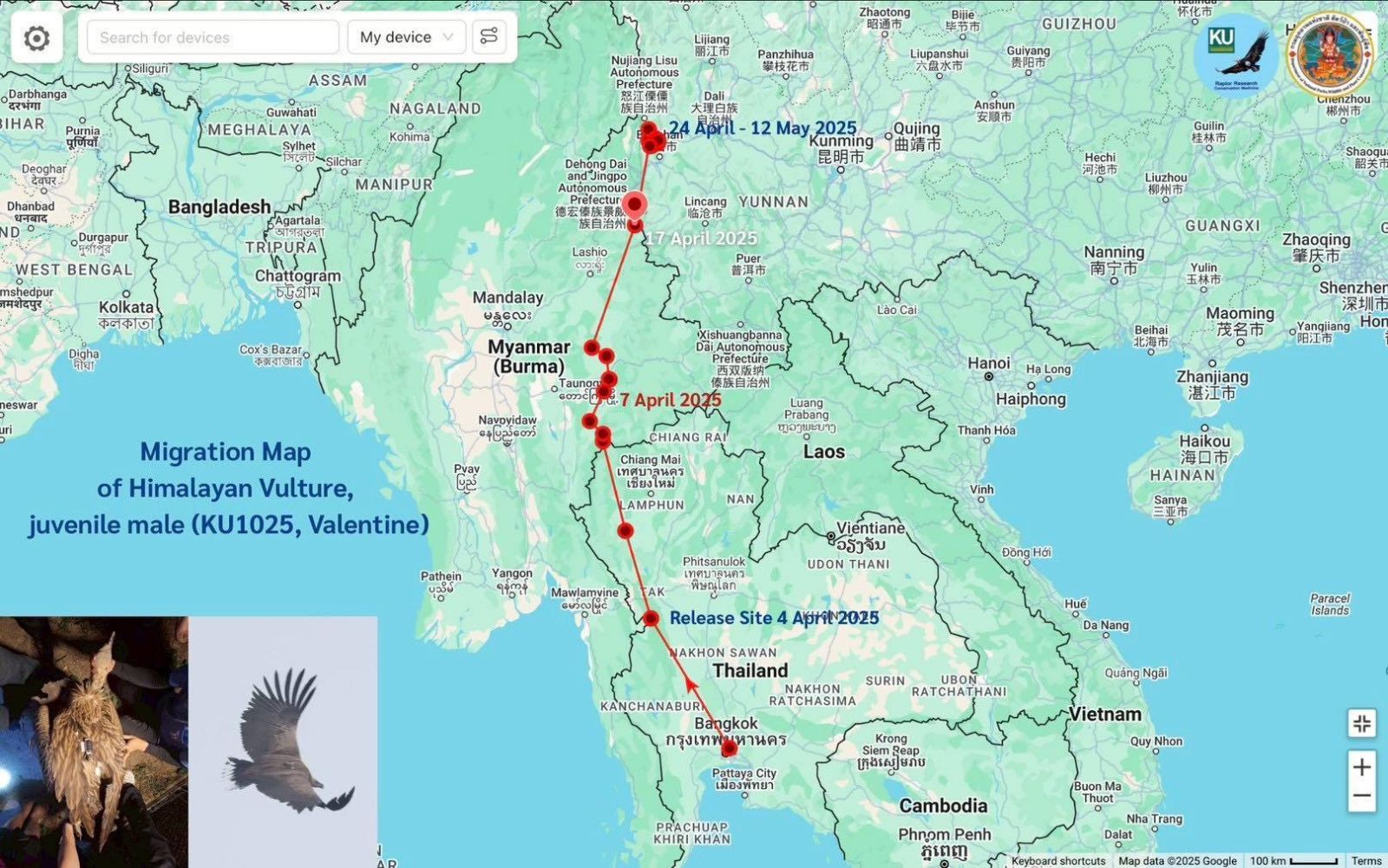 เวลาผ่านมากว่า 40 วัน พบการเคลื่อนไหวของอีแร้งสีน้ำตาลหิมาลัย จำนวน 2 ตัว คือ HImalayanVulture รหัส KU1025 ชื่อ วาเลนไทน์ อาศัยอยู่ในมณฑลยูนนาน ใกล้เมืองเป่าซาน ประเทศจีน ตั้งแต่วันที่ 26 เมษายน 2568 จนถึงในวันที่ 12 พฤษภาคม 2568 (ที่ติดตามข้อมูล) ซึ่งสภาพพื้นที่เป็นภูเขาสูงชันสลับหุบเขา สูง 1,200-3,000 เมตร เหนือระดับน้ำทะเล