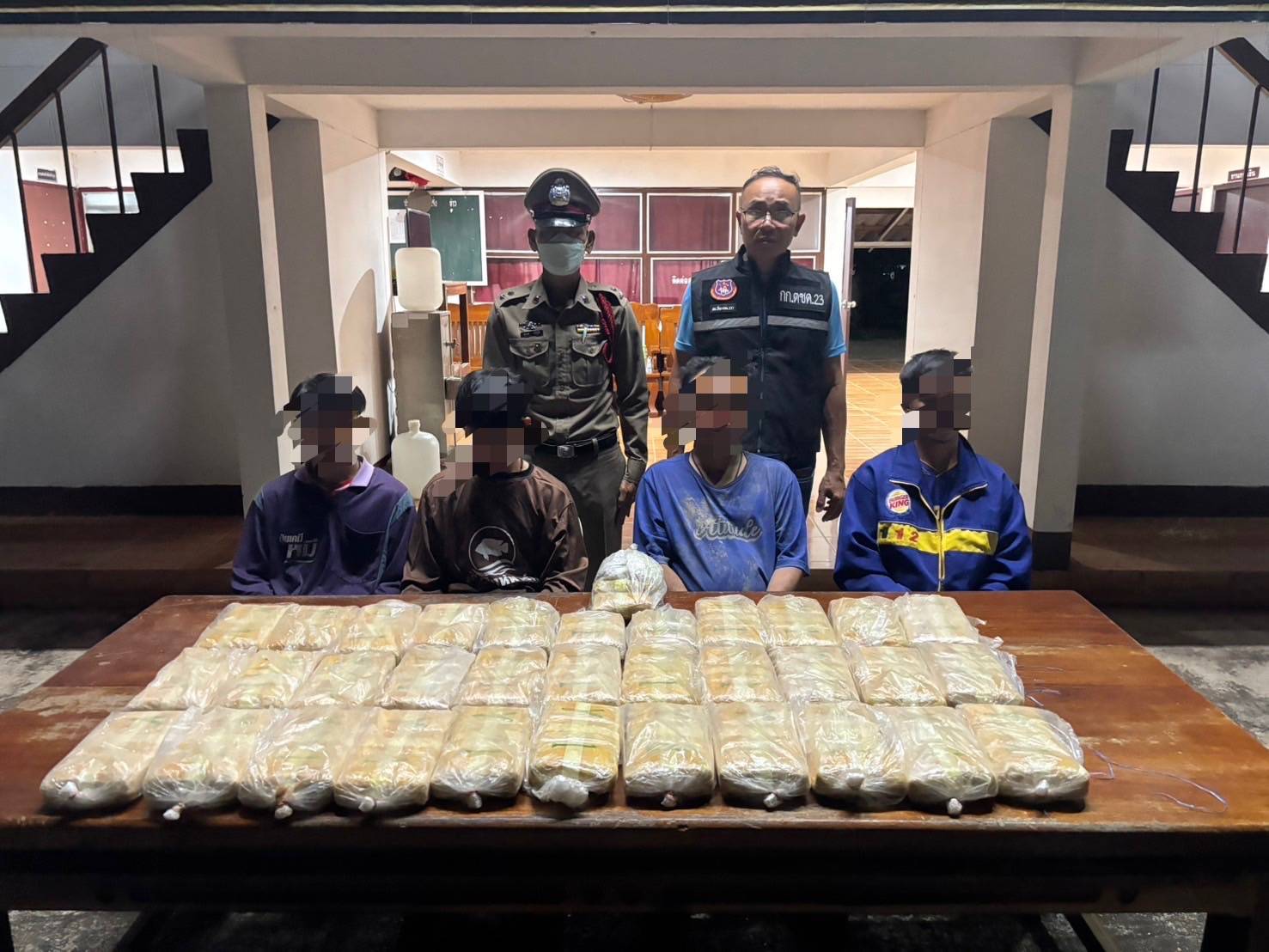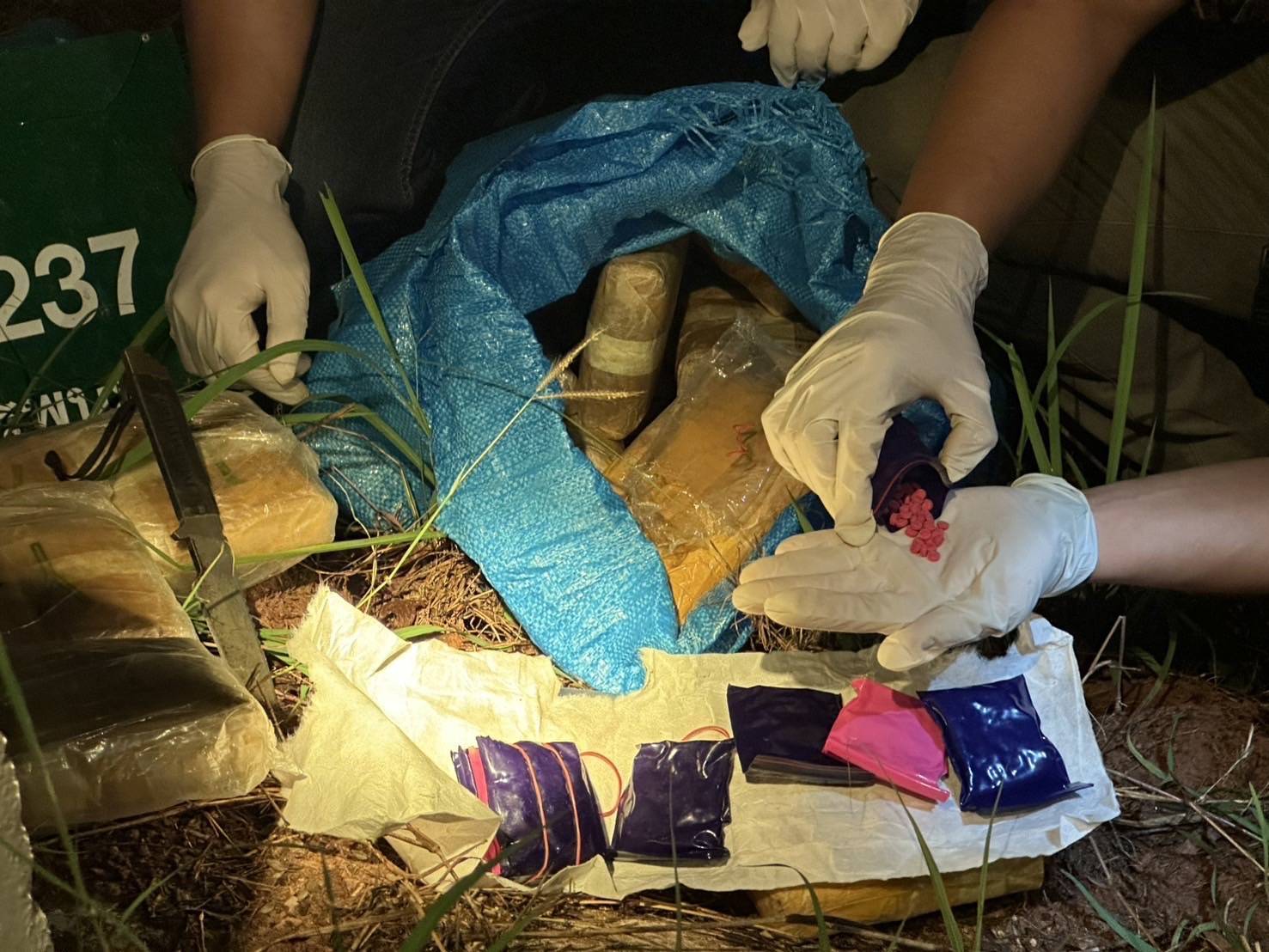 จากการตรวจสอบพบว่ากระสอบดังกล่าวบรรจุยาเสพติดยาบ้า จึงได้วางกำลังโดยรอบเพื่อดักซุ่มจับผู้ที่จะมารับนำยาเสพติดดังกล่าวไป จนกระทั่งเวลา 06.00 น. ไม่พบผู้ใดมาเอายาเสพติดไป จึงได้ทำการตรวจยึดและนำของกลางมายังที่ทำการกองร้อยตำรวจตระเวนชายแดนที่ 237 เพื่อตรวจสอบอย่างละเอียดและดำเนินการตามกฎหมายต่อไป