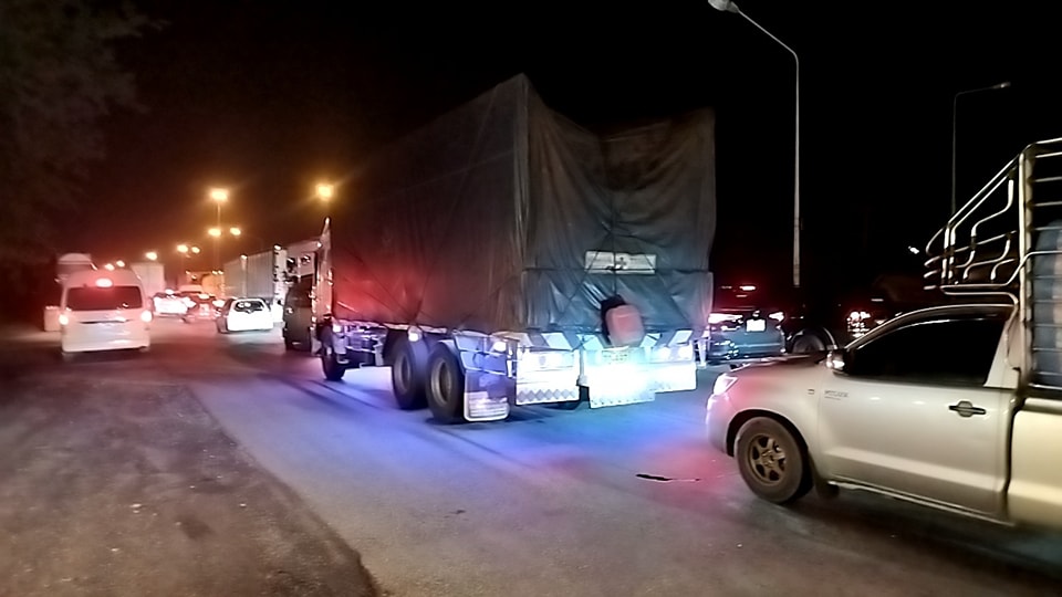 รถ 22 ล้อ บรรทุกเครื่องจักรใหญ่ ความสูงเกิน เลี้ยวเข้าซอยไม่ได้ ทำให้ตัวรถกีดขวางการจราจรถนนมิตรภาพ การจราจรผ่านได้แค่ 1 เลนขวา รถติดขัด ท้ายแถวเกือบ 10 กม.