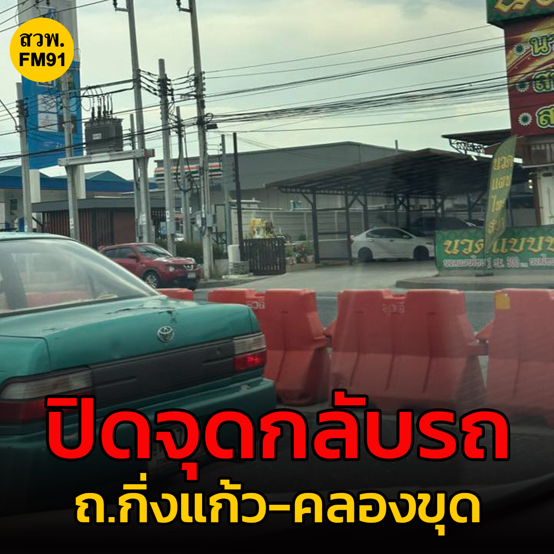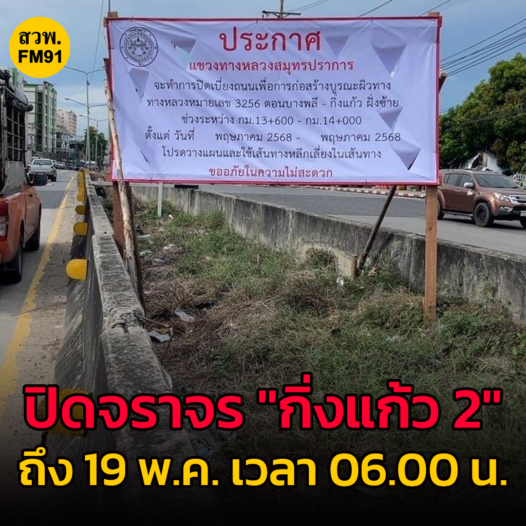 ถ.กิ่งแก้ว ที่มาจากลาดกระบัง จะเลี้ยวซ้ายออกบางนาตราด-ตลาดกิ่งแก้ว กรณีปิดซ่อมแซมพื้นผิวจราจร ปากซอยกิ่งแก้ว 2 ถึงเวลา 06.00 น. วันที่ 19 พ.ค. 68