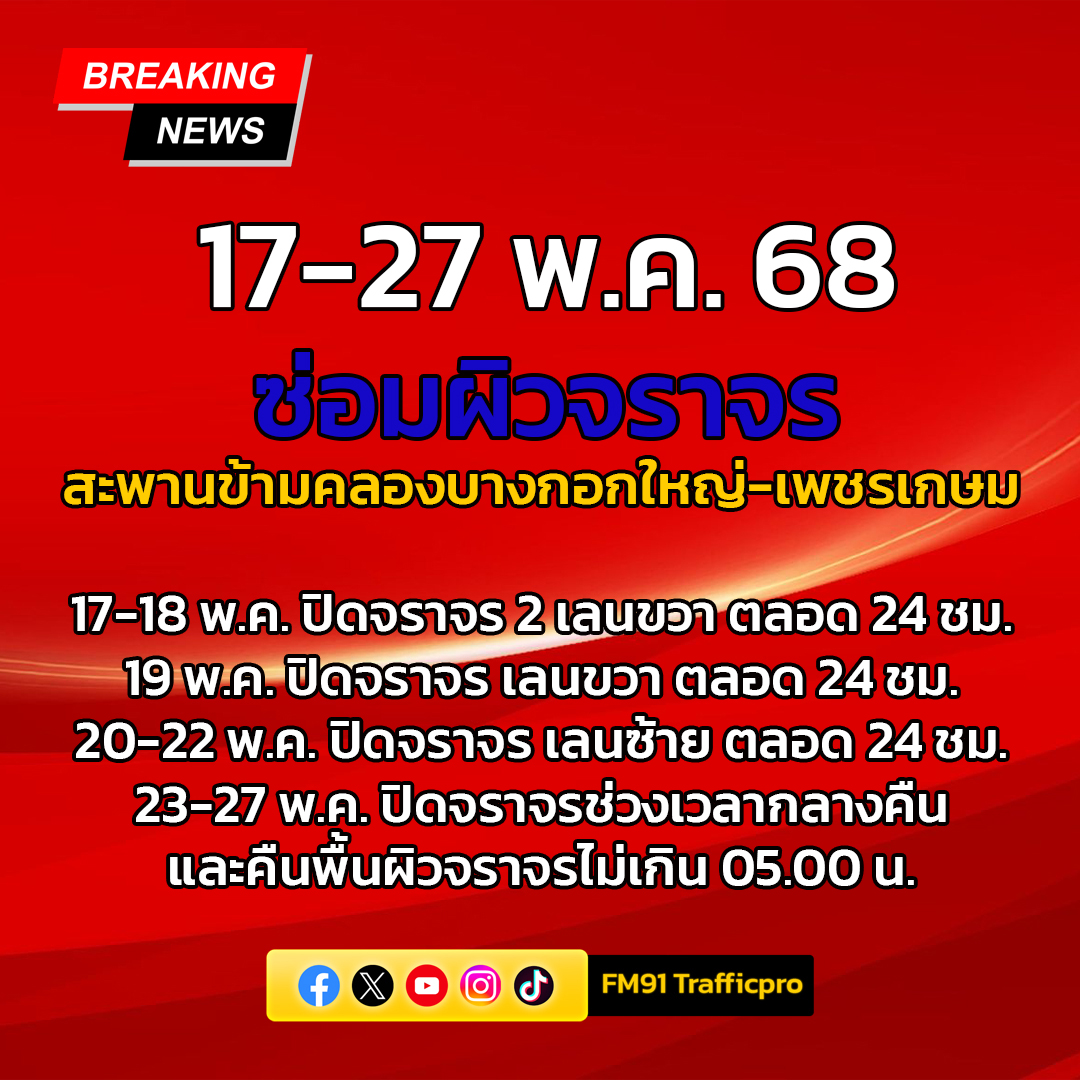 17-27 พ.ค. 68 งานซ่อมผิวจราจรสะพานข้ามคลองบางกอกใหญ่ (บางไผ่)