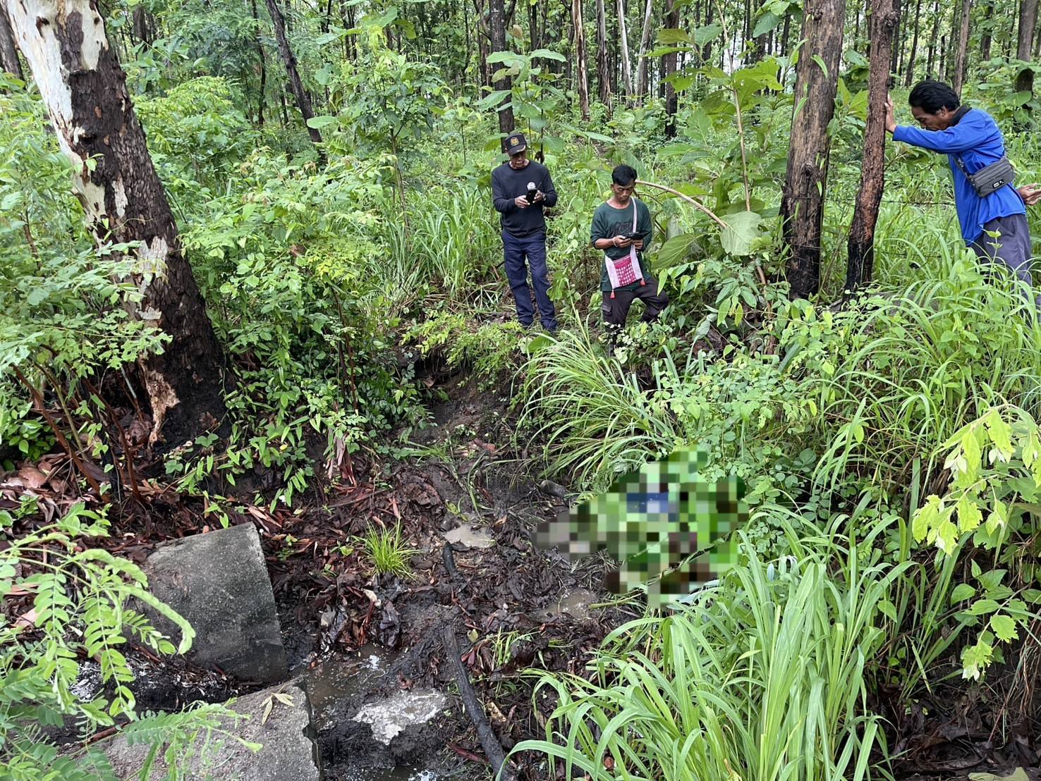 จากการตรวจสอบบริเวณที่เกิดเหตุ เจ้าหน้าที่พบถุงปุ๋ยจำนวน 2 ถุง ภายในมีอึ่ง สวิง 1 ด้าม ไฟฉาย และพบรถจักรยานยนต์ยี่ห้อ YAMAHA ทะเบียน 1กม 722 อุบลราชธานี ของผู้เสียชีวิตจอดอยู่ใกล้เคียง นอกจากนี้ยังพบร่องรอยของช้างป่าในบริเวณโดยรอบ