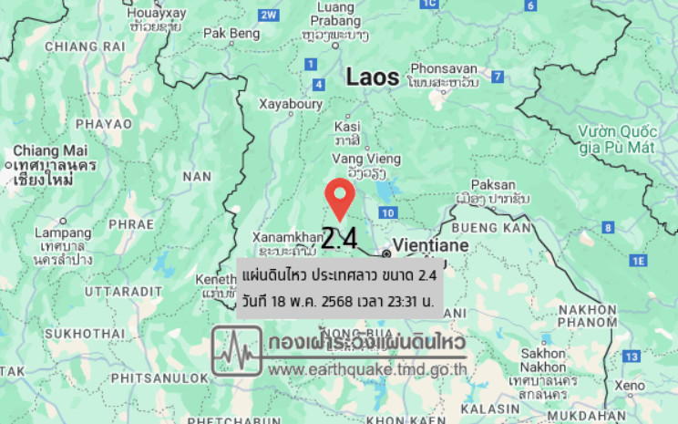 วันที่ 18 พ.ค. 2568 เวลา 23.31 น. กองเฝ้าระวังแผ่นดินไหว กรมอุตุนิยมวิทยา แจ้งว่าเกิดเหตุ แผ่นดินไหว ขนาด 2.4 ความลึก 1 กม. ภายในพื้นที่ของ ประเทศลาว(18.26°N,102.18°E) ศูนย์กลางห่างออกไปทางทิศตะวันออกเฉียงเหนือของ อ.เชียงคาน จ.เลย ประมาณ 68 กม. ยังไมีมีรายงานผลกระทบต่อประเทศไทย