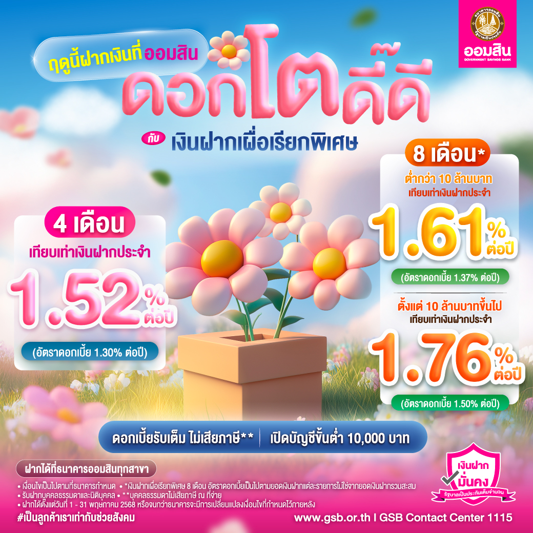 ฝากได้ตั้งแต่วันที่ 1 - 31 พ.ค. 68 ที่ธนาคารออมสินทุกสาขา