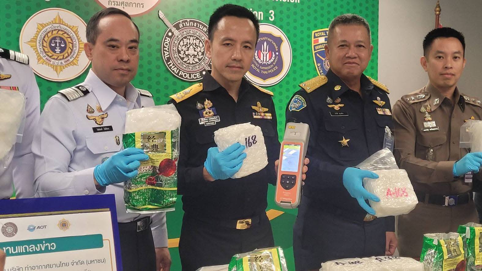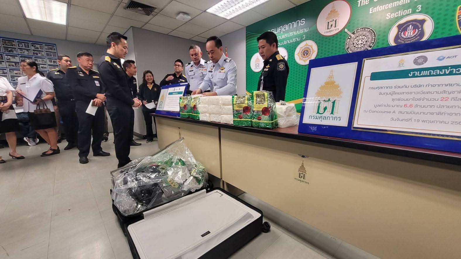19 พ.ค. 68 กรมศุลกากร แถลงร่วมกับบริษัท ท่าอากาศยานไทย จำกัด (มหาชน) จับกุมผู้โดยสารชายสัญชาติออสเตรเลีย ขณะพยายามลักลอบส่งออกไอซ์ มูลค่ากว่า 6.6 ล้านบาท ที่ท่าอากาศยานสุวรรณภูมิ โดยมี นายพันธ์ทอง ลอยกุลนันท์ ที่ปรึกษาด้านการพัฒนาและบริหารการจัดเก็บภาษี ในฐานะโฆษกกรมศุลกากร พร้อมด้วย นายกิตติพงศ์ กิตติขจร ผู้อำนวยการท่าอากาศยานสุวรรณภูมิ บริษัท ท่าอากาศยานไทย จำกัด (มหาชน) ร่วมแถลงข่าว