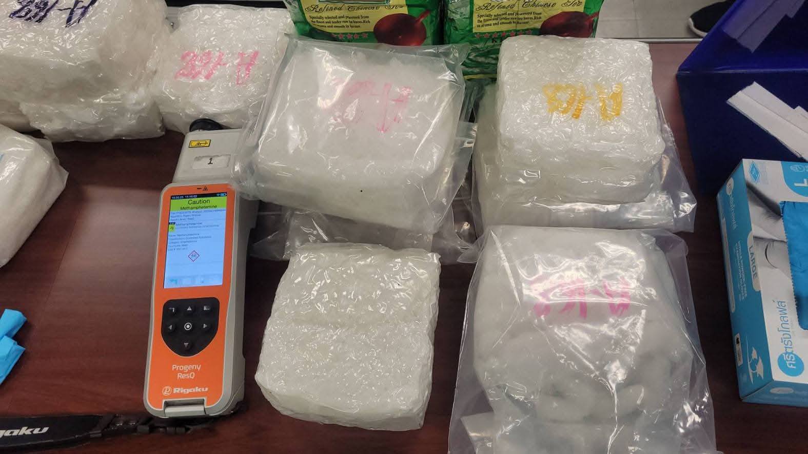 ผลการตรวจสอบกระเป๋าเดินทางแบบแข็งสีดำ จำนวน 1 ใบ พบวัตถุคล้ายเกล็ดสีขาวขุ่นบรรจุอยู่ในถุงชา ห่อหุ้มด้วยถุงสุญญากาศ เมื่อทำการทดสอบด้วยน้ำยาเคมี ผลปรากฏว่าวัตถุดังกล่าวทำปฏิกิริยาเปลี่ยนจากใสไม่มีสี เป็นสีน้ำตาล จึงเชื่อได้ว่าเป็นยาเสพติด (ไอซ์) น้ำหนักรวมสิ่งห่อหุ้ม 22 กิโลกรัม มูลค่าประมาณ 6,600,000 บาท