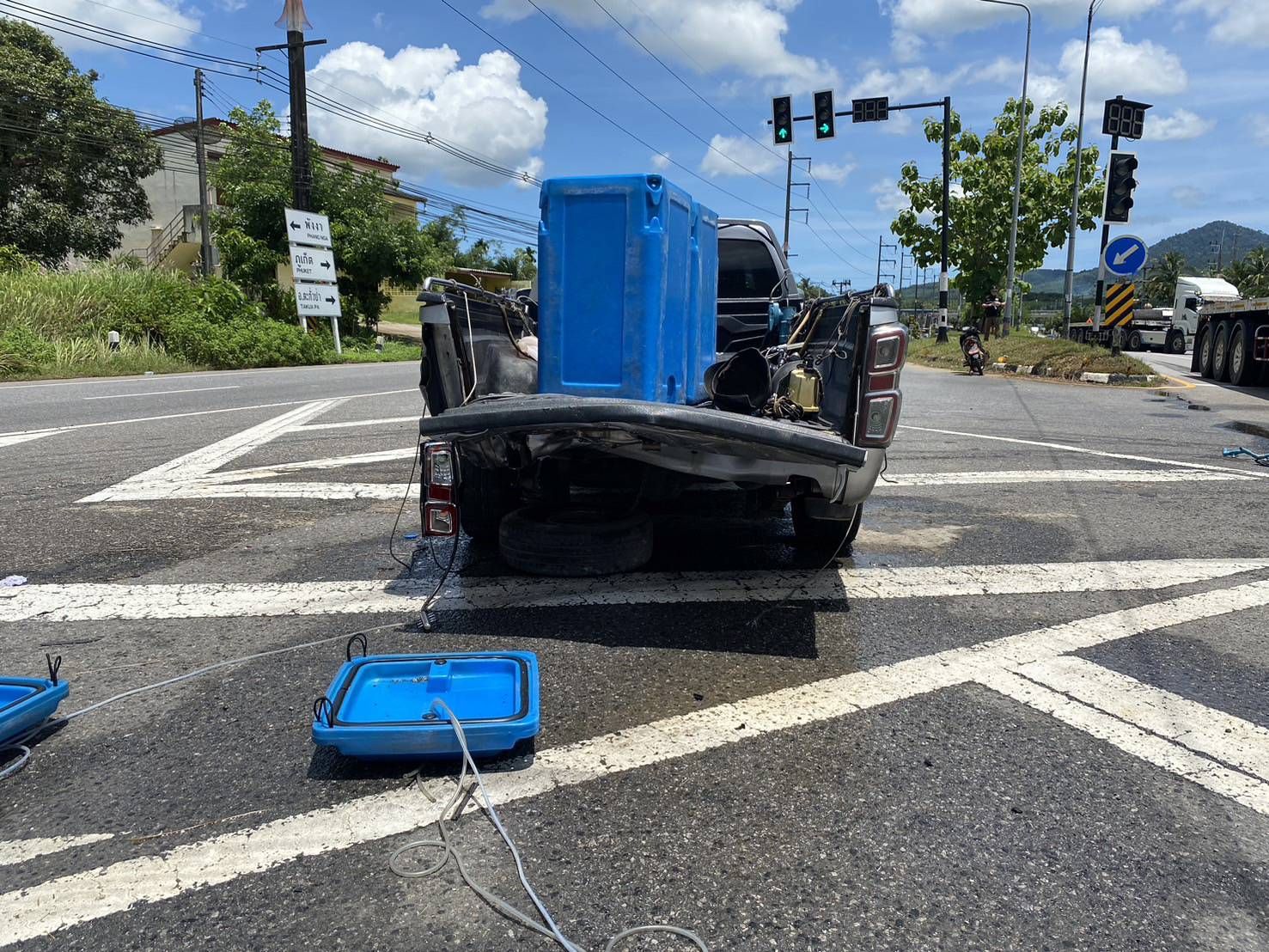 รถเทรลเลอร์ ชนกับรถนั่งส่วนบุคคล, รถกระบะ ขณะจอดติดไฟแดงที่สามแยกกะไหล ทำให้มีผู้ได้รับบาดเจ็บหลายราย จ.พังงา