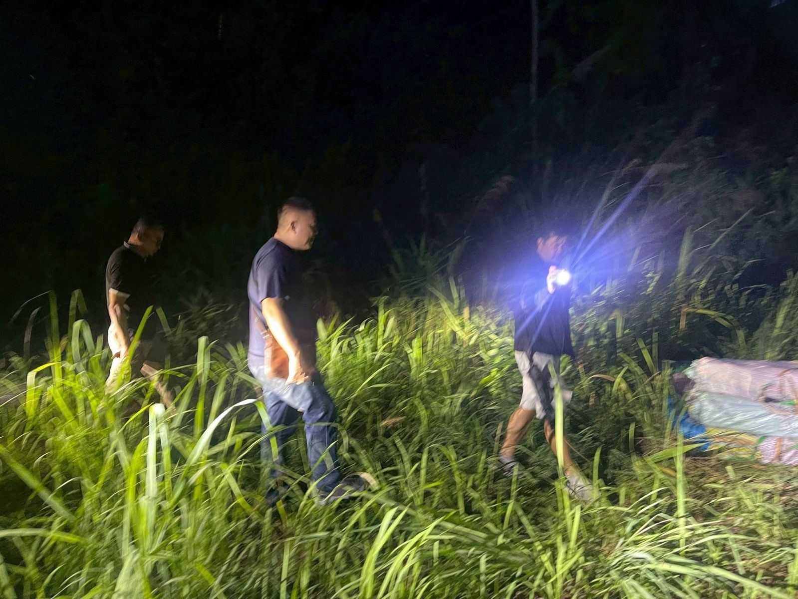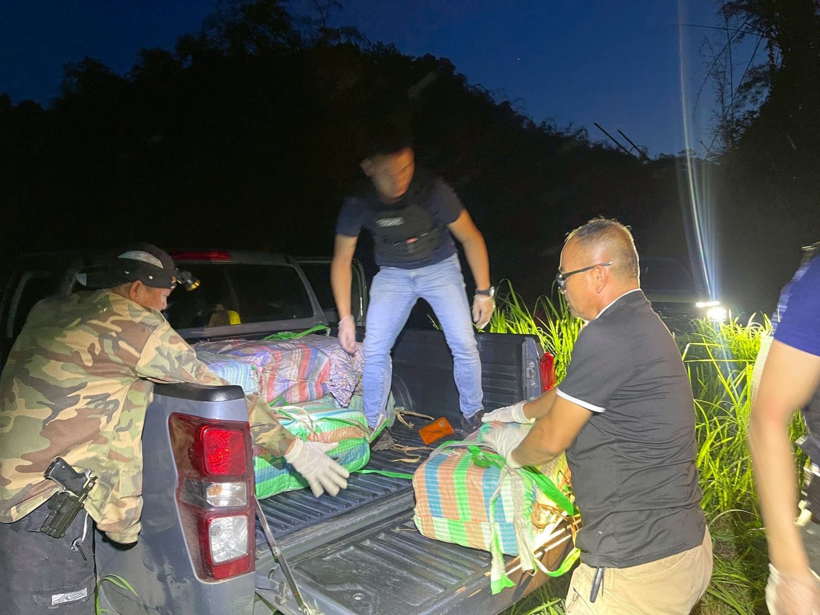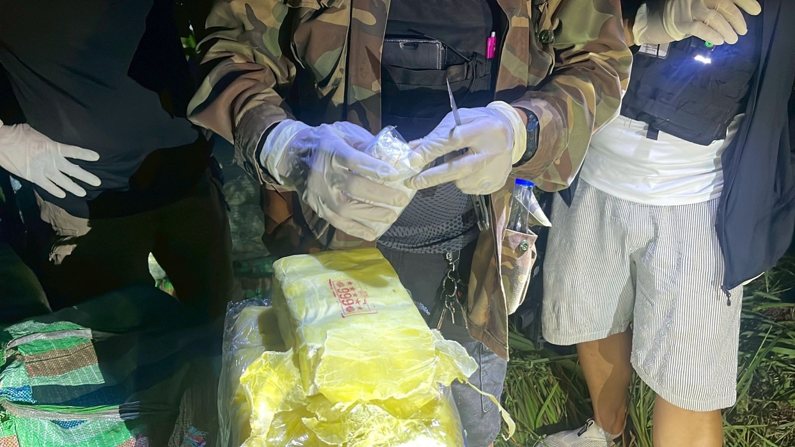 วันที่ 20 พฤษภาคม 2568 เจ้าหน้าที่ตำรวจชุดสืบสวน สภ.บ้านดู่ ภายใต้การอำนวยการของ พล.ต.ต.มานพ เสนากูล ผบก.ภ.จว.เชียงราย พ.ต.อ.ศันย์ชัย พานิชกุล ผู้กำกับการสถานีตำรวจภูธรบ้านดู่ จังหวัดเชียงราย นำโดย พ.ต.ต.ณัฐวุฒิ แก้วสืบ สว.สส.ฯ นำกำลังเจ้าหน้าที่ตำรวจชุดสืบสวนเข้าตรวจสอบบริเวณพงหญ้าริมอ่างเก็บน้ำ หมู่บ้านห้วยอ้มใหม่ หมู่ที่ 9 ตำบลแม่ข้าวต้ม อำเภอเมืองเชียงราย หลังได้รับแจ้งจากนายสมพิศ มุกดา ผู้ใหญ่บ้าน ว่าพบกระสอบต้องสงสัยจำนวนหลายใบถูกปกคลุมด้วยผ้าใบและกิ่งไม้ อำพรางไว้อย่างมิดชิด