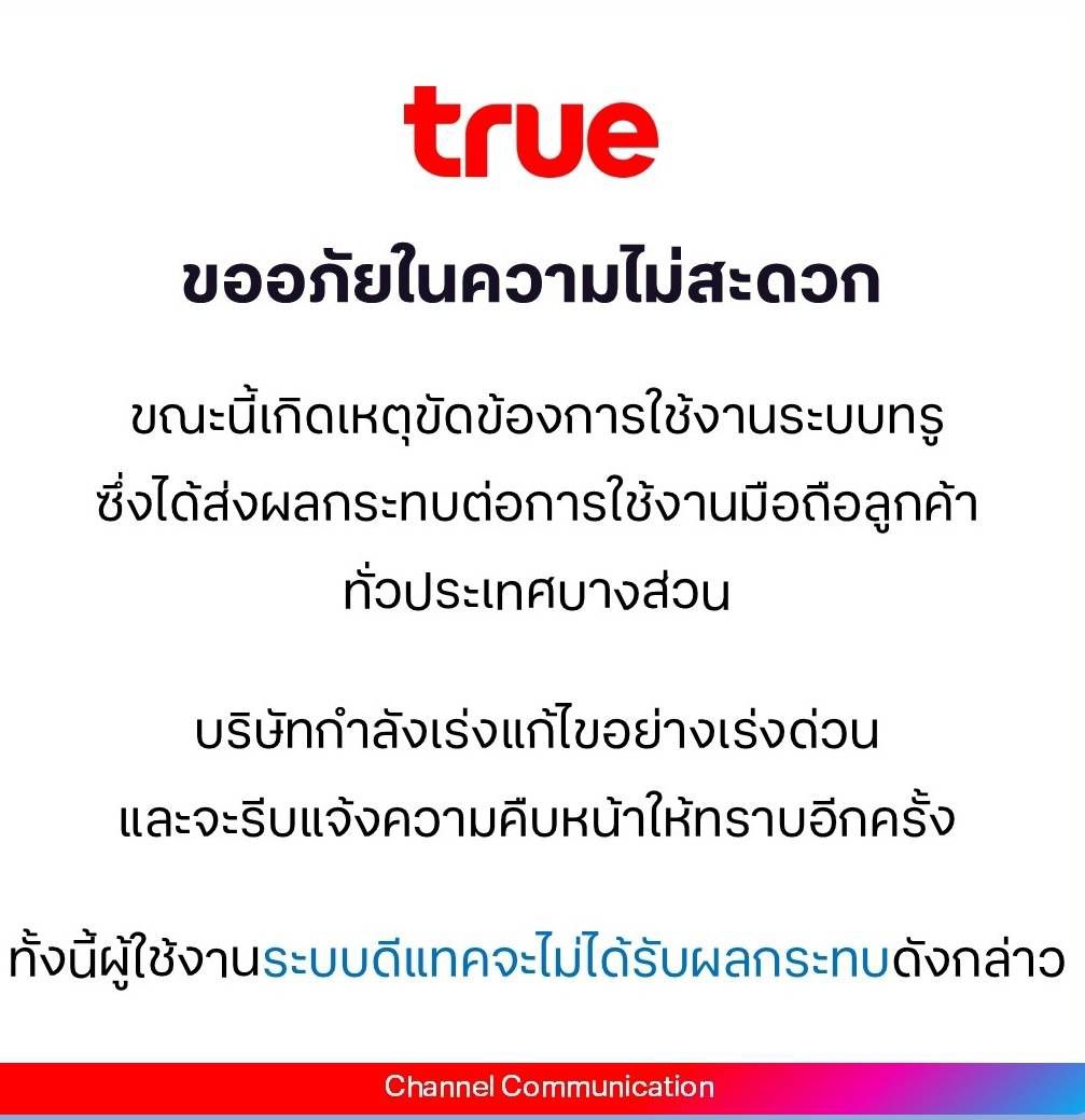 ถัดมา เวลา 11.18 น. รายงานจาก "ทรู" เผยแพร่ข้อความผ่านโซเชียลมิเดีย ระบุว่า ขออภัย สำหรับเหตุขัดข้องที่เกิดขึ้น ส่งผลกระทบต่อการใช้งานมือถือลูกค้าทรูทั่วประเทศบางส่วน ทีมงานกำลังเร่งแก้ไขอย่างเร่งด่วน ทั้งนี้ ผู้ใช้งานดีแทคจะไม่ได้รับผลกระทบดังกล่าว
