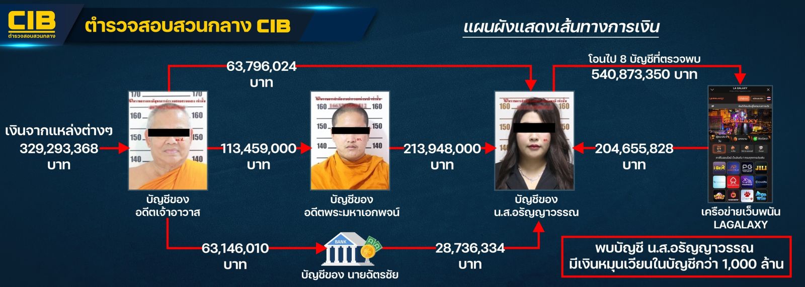 ขณะนี้ บก.ปปป. ตรวจสอบพบบัญชีธนาคารที่เกี่ยวข้องกับคดี 51 บัญชี บัญชีส่วนตัวของอดีตเจ้าอาวาส 21 บัญชี , อรัญญาวรรณ 12 บัญชี โดยมุ่งไปที่เงินหมุนเวียนของอรัญญาวรรณ พบว่าตั้งแต่ปี 2569 มีเงินหมุนเวียนกว่า 2,000 ล้านบาท โดยมี 4 ช่องทางในการรับเงิน 1.ฝากเงินเงินสด 2.รับโอนจากเจ้าอาวาส 3.รับโอนจากอดีตพระมหาเอกพจน์ 4. รับโอนเงินจากนายฉัตรชัย สีเลี้ยง ซึ่งจากพยานหลักฐานพบว่าไม่สอดคล้องกับคำให้การของอดีตเจ้าอาวาส