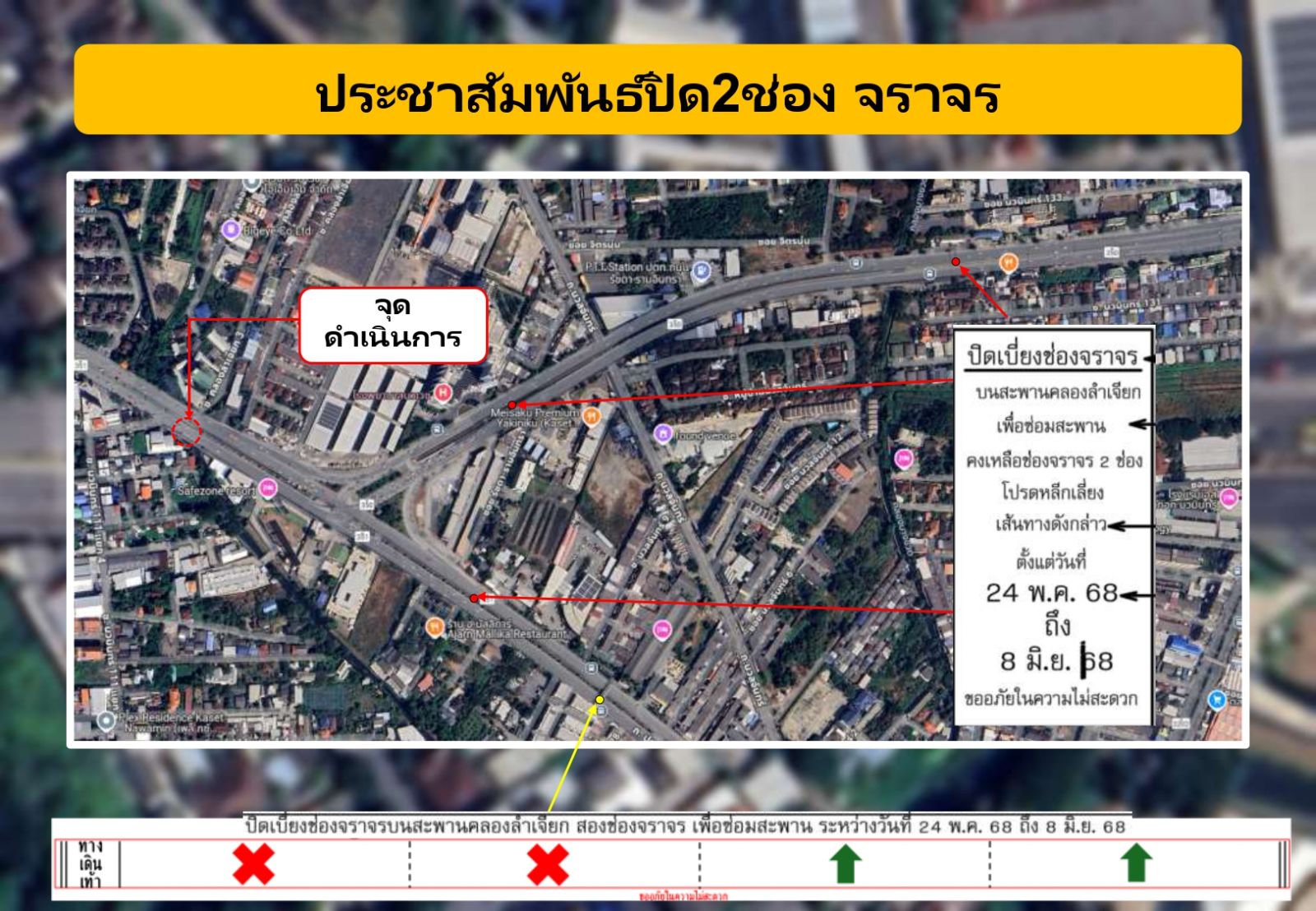ช่วงแรก 24-30 พ.ค. ปิดซ่อม 2 เลนซ้าย , ช่วงที่ 2 วันที่ 31 พ.ค.-8 มิ.ย.2568 ปิดซ่อม2 เลนขวา (รวมเวลา 16 วัน) โปรดหลีกเลี่ยง เส้นทางดังกล่าว ขออภัยในความไม่สะดวก