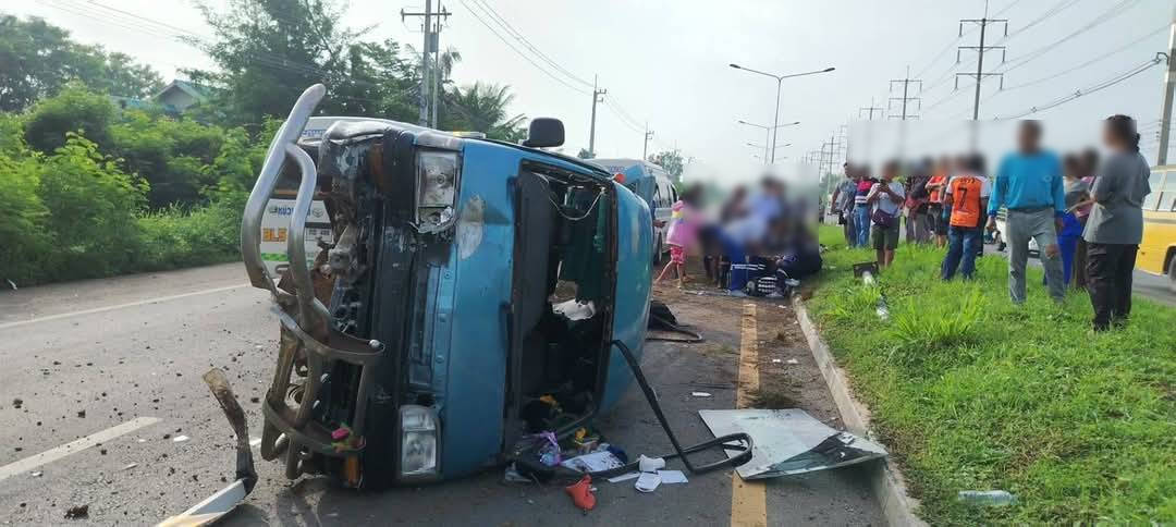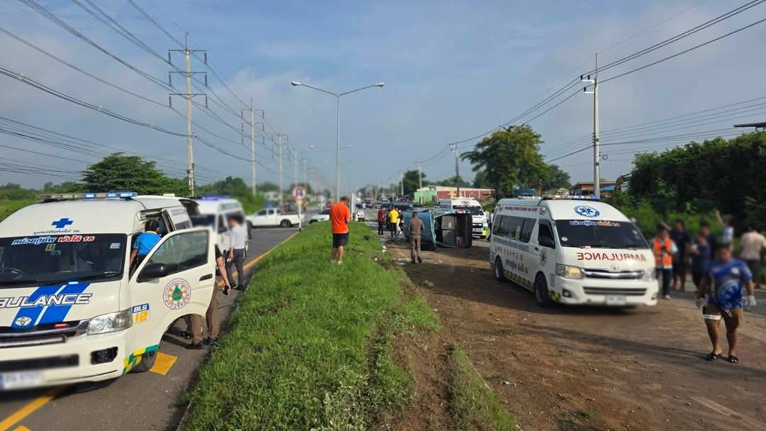 รถตู้รับ - ส่งนักเรียนชนเกาะกลางแล้วพลิกตะแคง มีผู้บาดเจ็บหลายราย โชคดีอาการไม่สาหัส จ.ลพบุรี