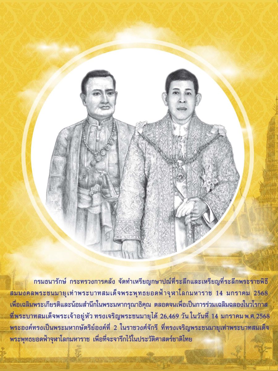 นายลวรณ แสงสนิท ปลัดกระทรวงการคลัง เปิดเผยว่าในโอกาสที่พระบาทสมเด็จพระปรเมนทรรามาธิบดีศรีสินทรมหาวชิราลงกรณ พระวชิรเกล้าเจ้าอยู่หัว ทรงเจริญพระชนมายุครบ 26,469 วัน เมื่อวันที่ 14 มกราคม 2568 เป็นสมมงคลพระชนมายุเท่าพระบาทสมเด็จพระพุทธยอดฟ้าจุฬาโลกมหาราช สมเด็จพระปฐมบรมกษัตริยาธิราชแห่งพระบรมราชจักรีวงศ์ นับเป็นมหามงคลสมัยยิ่ง