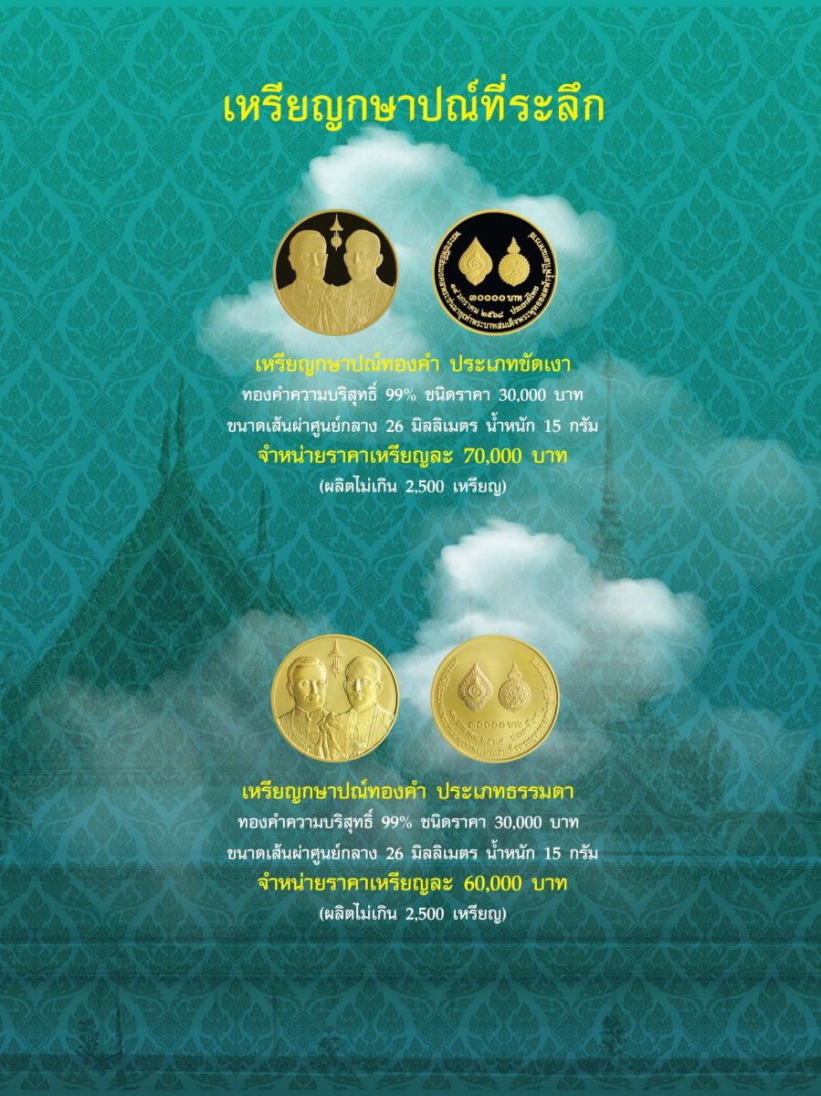 ทองคำความบริสุทธิ์ 99% ชนิดราคา 30,000 บาท ขนาดเส้นผ่าศูนย์กลาง 26 มิลลิเมตร น้ำหนัก 15 กรัม จำหน่ายราคาเหรียญละ 70,000 บาท (ผลิตไม่เกิน 2,500 เหรียญ)