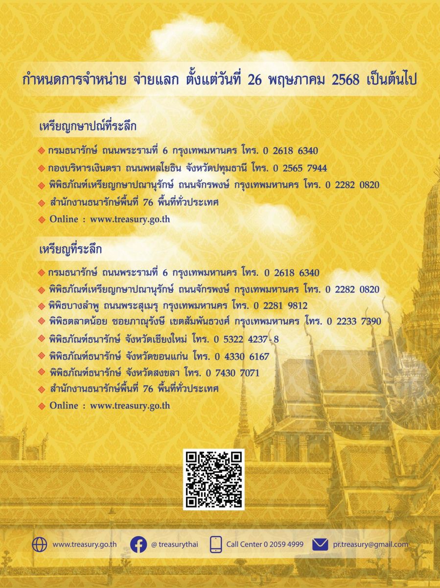 นายเอกนิติ อธิบดีกรมธนารักษ์ กล่าวว่า กรมธนารักษ์กำหนดเปิดจำหน่าย จ่ายแลก เหรียญกษาปณ์ที่ระลึก และเหรียญที่ระลึกดังกล่าว ตั้งแต่วันที่ 26 พฤษภาคม 2568 เป็นต้นไป ณ สถานที่ดังต่อไปนี้