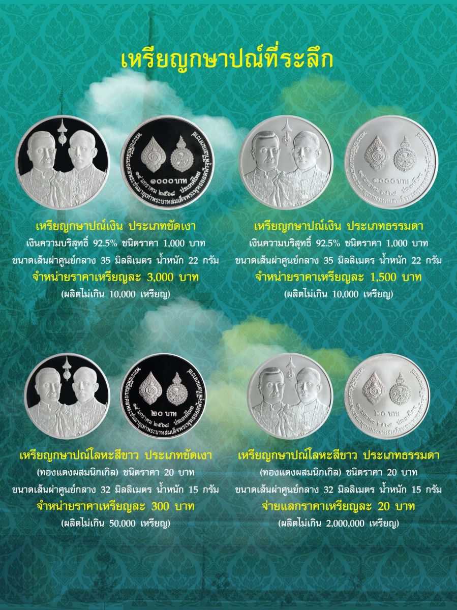 เงินความบริสุทธิ์ 92.5% ชนิดราคา 1,000 บาท ขนาดเส้นผ่าศูนย์กลาง 35 มิลลิเมตร น้ำหนัก 22 กรัม จำหน่ายราคาเหรียญละ 1,500 บาท (ผลิตไม่เกิน 10,000 เหรียญ)