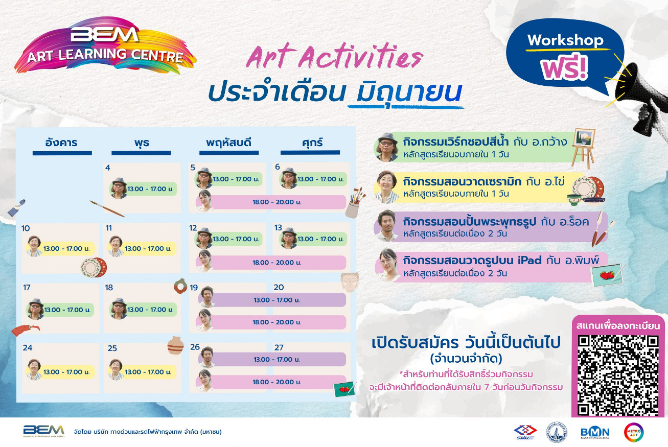 Art Learning Centre โดย บริษัท ทางด่วนและรถไฟฟ้ากรุงเทพ จำกัด (มหาชน) หรือ BEM ชวนทุกคนมาสร้างโมเม้นต์ดีๆ ผ่านการผลิตผลงานศิลปะหลากหลายแขนงไปกับ Art Activities ประจำเดือนมิถุนายน ที่พร้อมเสิร์ฟกันถึงที่ ในสถานีรถไฟฟ้า MRT สถานีพหลโยธินแบบไม่มีค่าใช้จ่าย โดยจะได้พบกับ การสอนวาดสีน้ำ จาก อ.บุญกว้าง นนท์เจริญ ศิลปินสีน้ำระดับโลก, การสอนวาดเซรามิก จาก อ.รัชดา หนองบัว ศิลปินอิสระ เจ้าของแบรนด์ Vilan by Familyclay, การสอนปั้นพระพุทธรูป โดย อ.ตะวัน สิโยพุทธวงศ์ ศิลปินผู้เชี่ยวชาญงานประติมากรรม และ การสอนวาดรูปบน iPad โดย อ.สาริน ปิติบัณฑิตนักวาดภาพประกอบดิจิทัลและสื่อผสมสีน้ำ เจ้าของแฟนเพจ Melt the moment โดยกิจกรรมนี้ผู้เรียนเตรียมไอแพดมาเอง