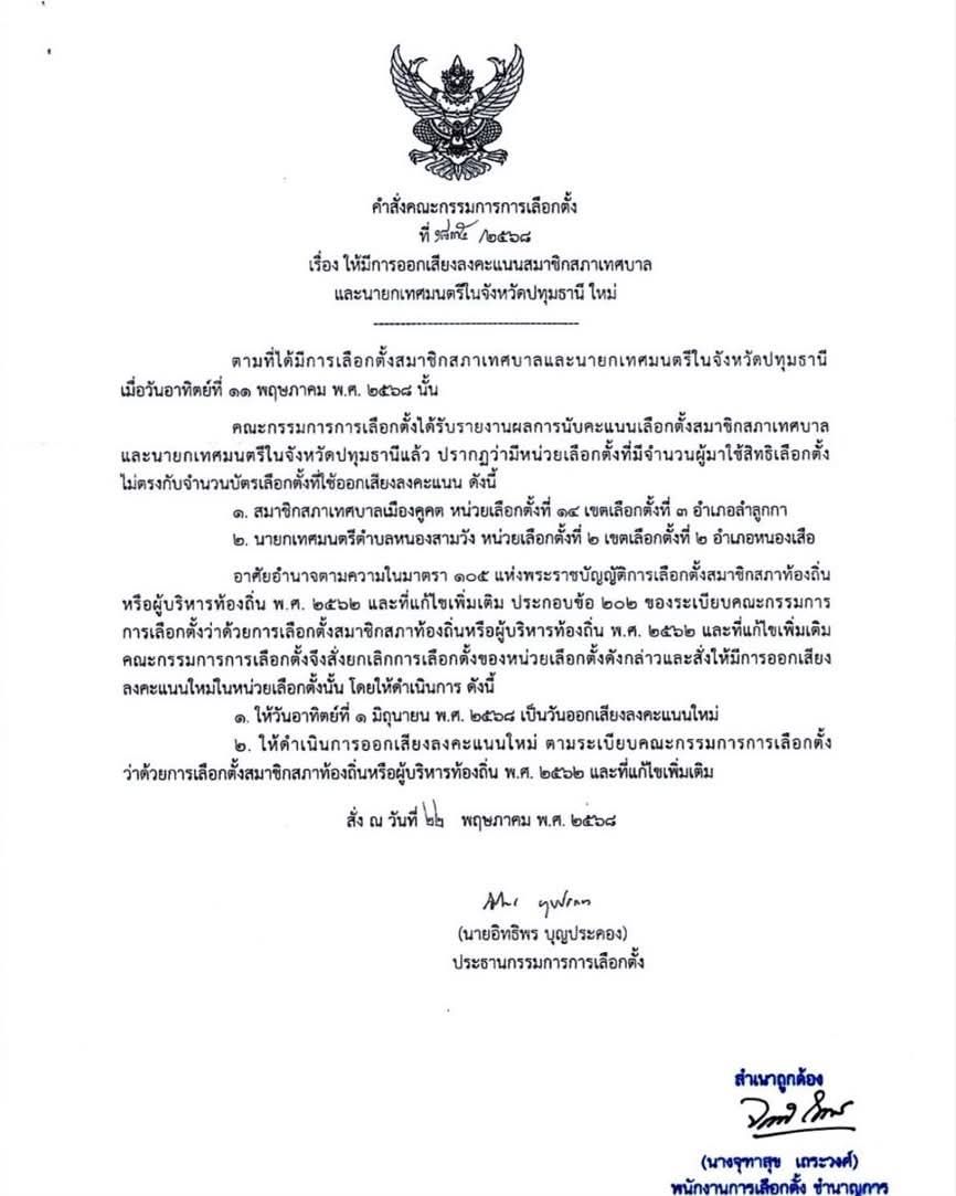วันนี้ 23 พฤษภาคม 2568 คำสั่งคณะกรรมการการเลือกตั้งที่ 1835/2568 เรื่องให้มีการออกเสียงลงคะแนน สมาชิกสภาเทศบาลและนายกเทศมนตรีในจังหวัดปทุมธานีใหม่ตามที่ได้มีการเลือกตั้งสมาชิกสภาเทศบาลและนายกเทศมนตรีในจังหวัดปทุมธานี เมื่อวันอาทิตย์ที่ 11 พฤษภาคม 2568 นั้น