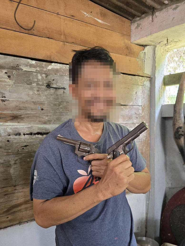 จากนั้นได้พาไปตรวจยึดอาวุธปืนภายในห้องพักหลังบ้าน พบอาวุธปืนพก ชนิดรีวอลเวอร์ ขนาด .22 จำนวน 1 กระบอก และ ชนิดออโตเมติก ขนาด .22 จำนวน 1 กระบอก กระสุนปืน ขนาด .22 จำนวน 47 นัด กระสุนปืนขนาด ขนาด 9 มม. จำนวน 30 นัด รวมทั้งสิ้น 77 นัด และอุปกรณ์เสพยา ทั้งยาบ้า-ยาไอซ์ วางอยู่เกลื่อนกลาด พบถ้วย โถ ชาม ชุดลายเบญจรงค์ เป็นของใหม่สภาพดี อีกกว่า 50 รายการ ซึ่งรับว่าเป็นของลูกน้องที่เอามาแลกยา ซึ่งเชื่อว่าเป็นของที่ถูกลักมา จึงได้ตรวจยึดไว้ เพื่อหาผู้เสียหายต่อไป