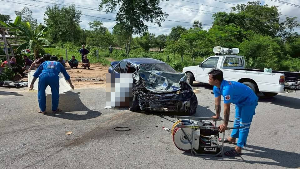 คุณลุงวัย 60 กว่าปีขับรถเก๋งชนกับรถบรรทุก กลางถนนสายสมเด็จ - สกลนคร เสียชีวิตในซากรถ จ.กาฬสินธุ์